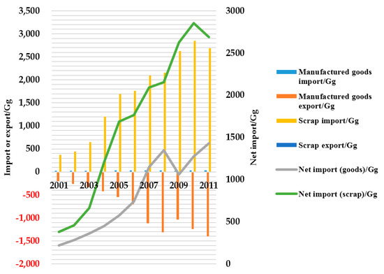 The import and export situation of manufactured goods and scrap in mainland China in the period of 2001–2011 are displayed in Figure 8. The imported amount and exported amount of manufactured goods are increased at a speed of 5.2% and 23%, respectively. The exported amount is much more than the imported amount; consequently, the net import amount was negative. Combined with the trade situation of aluminum products, an essential condition can be found: China imported aluminum products but exported manufactured goods, and became an important manufacturing center during this period. This finding is consistent with Chen [10]. As for scrap, because of almost no export, the amount of net import is decided by import, and the average annual growth rate is 25%. The energy required for the separation and remelting of aluminum scrap to produce secondary aluminum might be only 5%–10% of that needed for primary aluminum [31,58], therefore substantial imported scrap not only relieves the pressure on the domestic environment in the course of producing primary aluminum, but also can satisfy the needs of China’s rapid industrialization and urbanization.