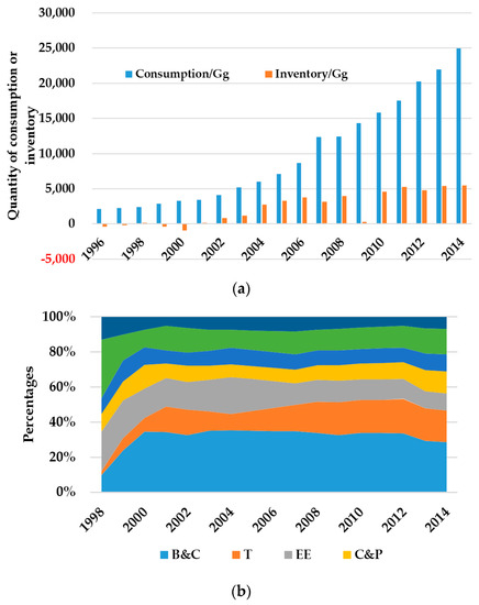 (a) Quantities of consumption and inventory from 1996 to 2014; (b) consumption composition varying from 1998 to 2014. B&C: Building and Construction; T: Transportation; EE: Electrical Engineering; C&P: Containers and Packaging; M&E: Machinery and Equipment; CD: Consumer Durables (data source: Research Center for Strategy of Global Mineral Resources, Chinese Academy of Geological Science).