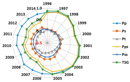 The line with dots (TSG) in Figure 10 shows the situation of total supply guarantee of self-productive aluminum, and the degrees gradually weakened: in 1996–1998, China’s aluminum industry was self-sufficient, but after 2006 the total supply guarantee degree of China’s aluminum resource was only about 50%, or 45% in 2007 and 2011. From the point of the whole supply chain, the upstream of China’s aluminum industry is in short supply, and the downstream of it can basically satisfy domestic needs. So resource constraint is a significant factor that will influence the sustainable development of China’s aluminum industry.