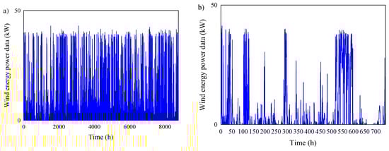 In this paper, wind energy systems (both off-grid and grid-connected) are investigated. For the stand-alone wind energy system, the practical wind speed data (at 39°54’ N, 105°14′ W) exported from the American Wind Energy Technology Center are derived into HOMER software [,] to calculate the actual wind power according to the selected wind turbine type. HOMER is a micropower system optimization software, which can perform thousands of simulations to find the optimal configuration of both off-grid and grid-connected microgrid systems. The stand-alone wind energy system includes wind turbines as the energy generator, which is presented in the following sections, and they are established for gaining the wind power data. The rated power of the wind turbine type is 3.2 kW (12 machines for the optimization result). Figure 1 shows the wind power data of an isolated grid system all year and in January, respectively. The average value of the wind power is 5.9 kW, and its maximum value reaches 37.9 kW.