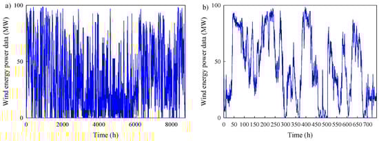 For the grid-connected wind energy system, the practical wind power data is collected from an actual wind farm (Fujian Province in China). Figure 2 shows the wind power data of the grid-connected system all year and in January, respectively. The average value of the wind power is 33.0 MW.