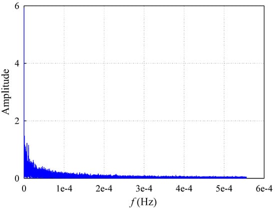 In step 1, based on the spectral analysis method, the amplitude-frequency characteristic curve of the wind power data for the stand-alone wind energy system (Figure 1) is obtained, as shown in Figure 3. In Figure 3, the amplitude of the wind power data is 5.9 when f equals 0, and the value is close to 0 when f is greater than 2 × 10−4 Hz. The magnitude of the signal amplitude in the spectrum characteristic curve, to a certain extent, reflects the strength of the signal at the corresponding frequency. It can be found that the energy of the wind power data concentrates at the frequency below 1 × 10−4 Hz.