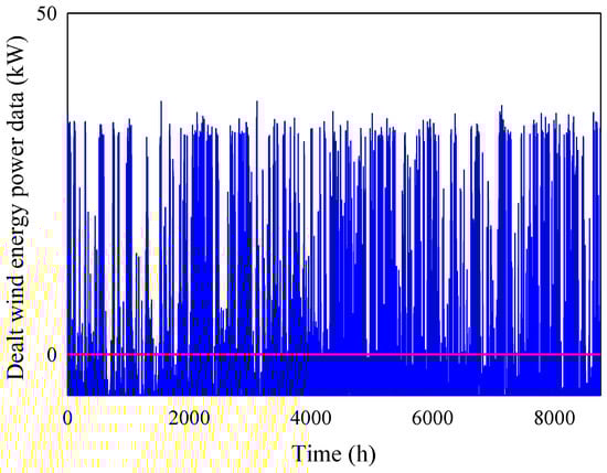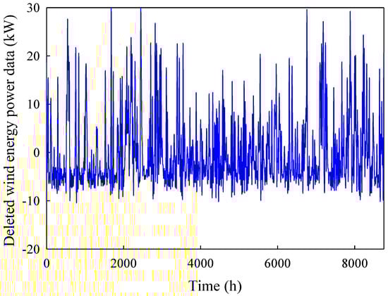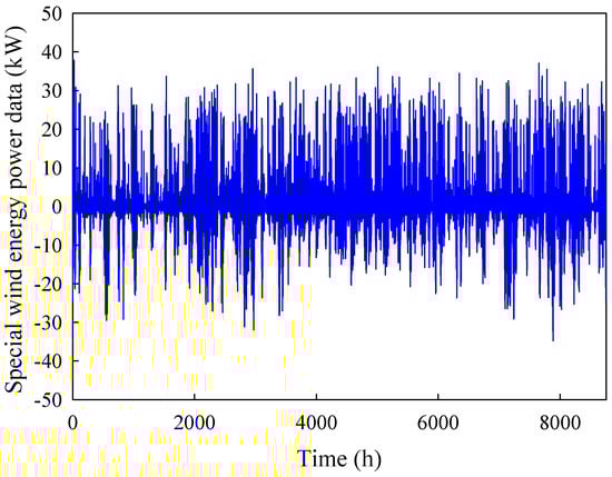 In step 2, the amplitude for when the frequency equals zero (Figure 4) is set to zero using Equation (2). The new wind power data without the DC component (Figure 5) are obtained by the inverse DFT. It can be found that they are the same as the shape of the graph through a comparison between Figure 1 and Figure 4. Moreover, the values of the wind power for Figure 4 are 5.9 kW lower than the wind power values of Figure 1, in general.