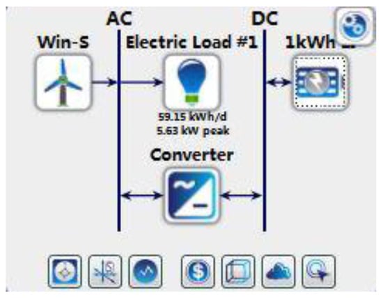 The stand-alone wind energy system is a combination of a wind turbine, battery bank, and inverter converting electricity between DC and AC as shown in Figure 7. The control unit of the wind turbine is a maximum power point tracker (MPPT) to extract the maximum possible energy, regardless of the variation in weather conditions. In the paper, an autonomous stand-alone wind energy system is used to meet the electricity requirements of a typical residential load (59.15 kWh per day with 5.63 kW peak power).