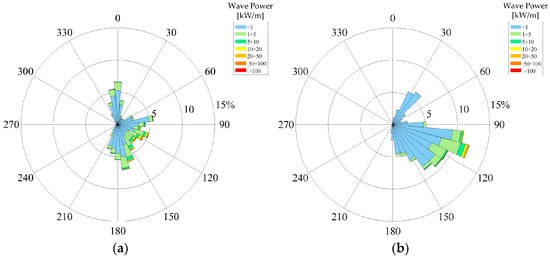 Figure 4, as a function of wave direction of propagation and of wave conditions respectively. Such distributions highlight the fact that the greatest part of offshore mean power comes from the sector 60°–210° N, while a small energy component arrives from the North. In more detail, the offshore annual mean power is equal to 1.75 kW/m and is mainly due to sea states having significant height in the range 0.5–2 m.