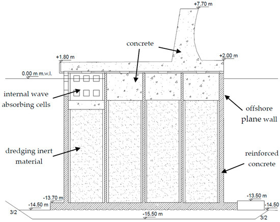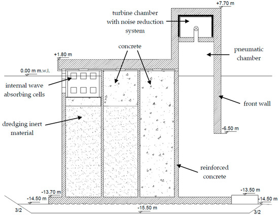 The presence of a WEC device embedded in the breakwater needs several modification to such a planned section, mainly concentrated at its offshore side. In particular, the first seaward chamber of the caisson becomes the active part of the OWC system, so it is connected to sea at the bottom and forms the pneumatic chamber at the top. Furthermore, the PTO (turbine) could be inserted in the first chamber in order to locate the dock along the remaining shoreward part of breakwater.