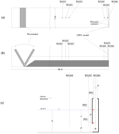 Interactions between waves, front wall and rear air chamber of the model are monitored by means of six wave gauges and three pressure sensor. In detail, three wave gauges (WG01–03) are installed in the center of channel, about 2 m far from the structure. Such gauges are used for the evaluation of the reflection coefficient. Furthermore two gauges (WG04–05) are placed in front of the structure for the evaluation of the wave motion near the front wall. The last wave gauge (WG06) is inserted in the central chamber of the model, in order to furnish data on the air-water interaction inside the OWC.