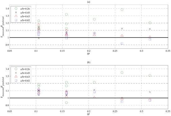 42]. Therefore, values greater than 1 mean that measured forces are underpredicted. In abscissa the relative wave height