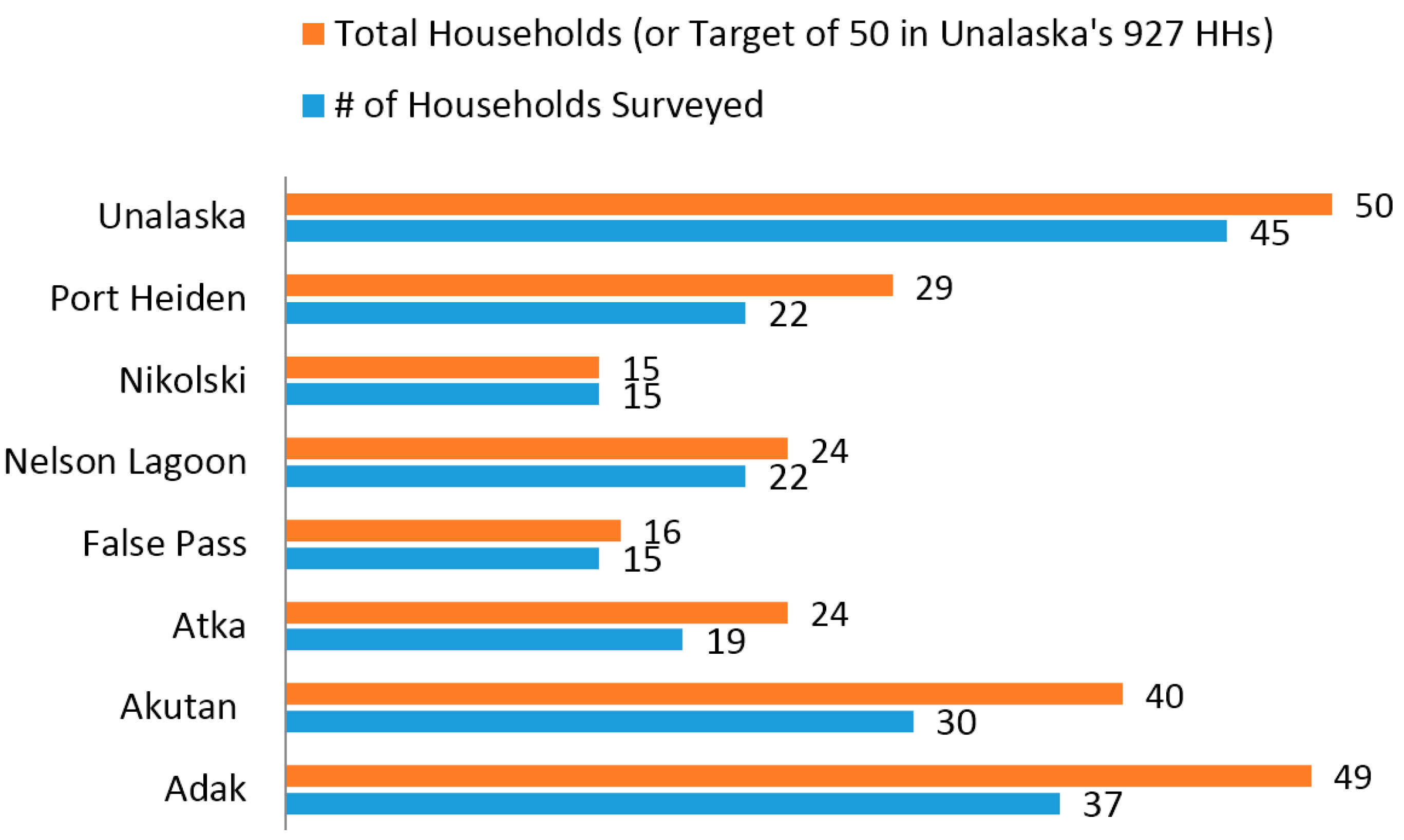 Both studies involved interviews with key informants and comprehensive household surveys with all available households in each community. Using household and community level data, the studies documented subsistence harvests, distribution practices and levels, social dynamics that contribute to those practices, mapped harvest areas using GIS, and described household and community economics. The studies also investigated the role of wild foods and products in household distribution networks, access to subsistence foods (regulatory, obtainability, socioeconomic and logistical), costs incurred, and resources (e.g., equipment, crews) needed in order to harvest. Surveys gathered ecological observation data in conjunction with species observations to evaluate climate change impacts on subsistence fish and other species. Interview data are also from two others communities not recently surveyed (King Cove and Sand Point) but extensively interviewed over the past 15 years.