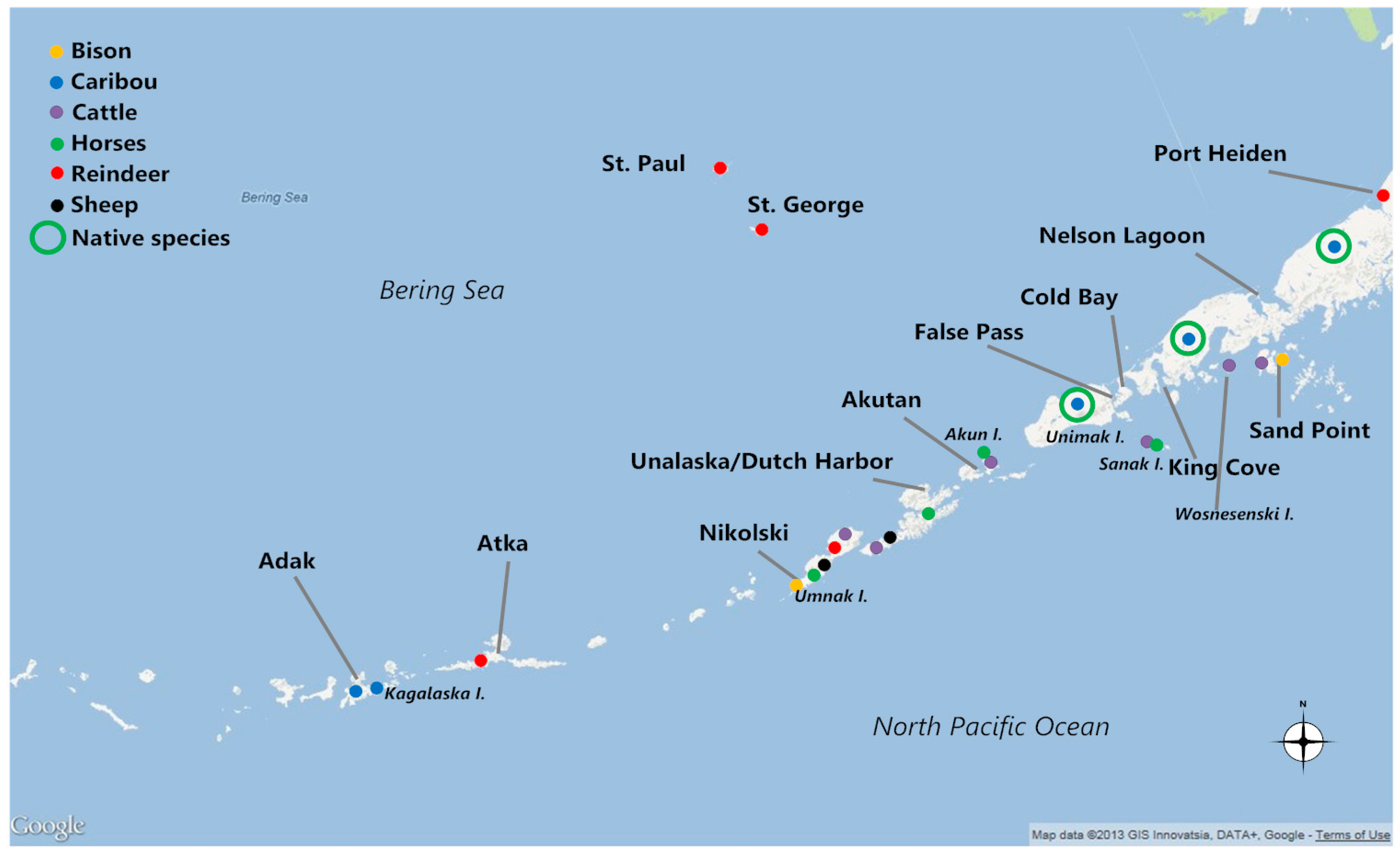 In the Aleutians, the introduction of non-Native land mammals was first carried out by Russian colonizers. The Russians traveled with their own food on the hoof. Russian Orthodox Priest Ivan Veniaminov wrote of several communities and islands supporting cattle in the 1830s (Unalaska, Belkofski, Unga, and Kashega) and swine (Unalaska, Makushin, Kashega, and Cherni) and others’ potential in supporting cattle breeding and horses because of the terrain, low snowfall, abundance of greenery for feed, and fresh water sources [37]. Chickens, ducks, and goats were also brought in for food. He did not believe the Aleut people would have the interest to learn husbandry and labor to be successful, however.