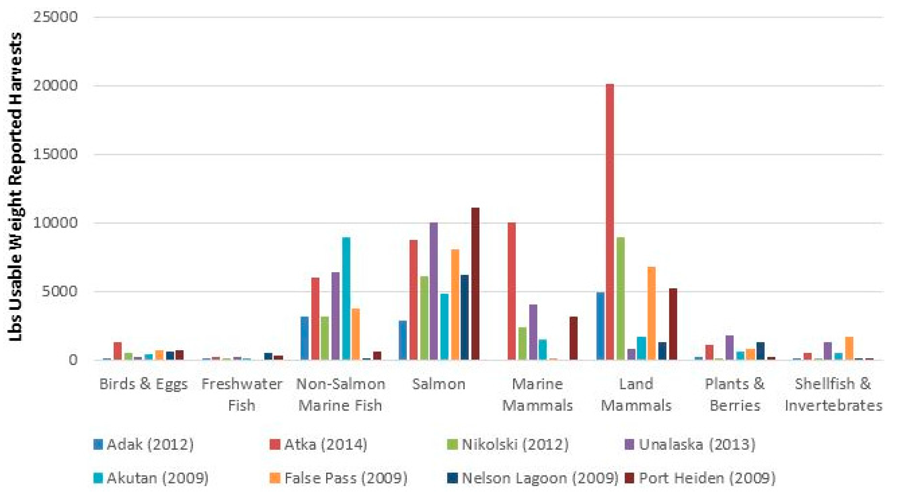 | Land Mammals (Lbs Harvested) | 4950 | 20,100 | 8954 | 850 | 1700 | 6810 | 1325 | 5238.6 |