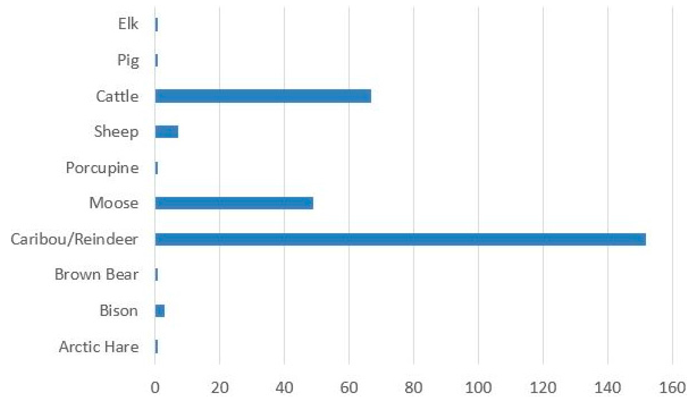 The current inventory of land mammals shows a large range and quantity of introduced species (Table 1, Figure 3). The communities on the Alaska Peninsula and Unimak Island also hunt native brown bear, wolves, fox, and wolverine, but these are not eaten, except for one portion of brown bear. There are no other predators besides people on all other islands except for Unimak.