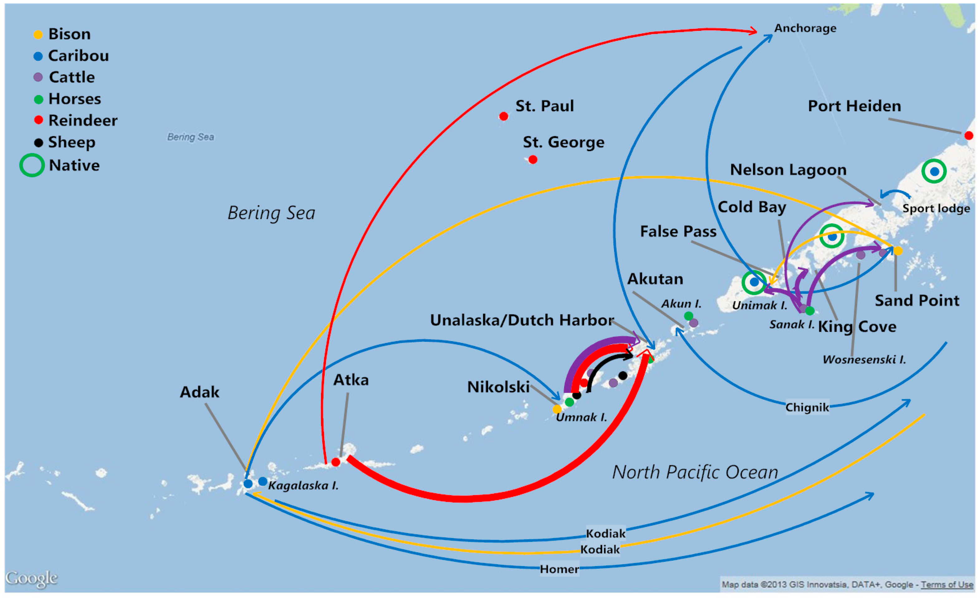 This paper considers the role of introduced land mammals in the region by examining their introduction and development, their local management, local uses and values, and the legal structure around introduced species. The purpose is to demonstrate the contribution of these animals in a predominately marine environment to community sustainability and to evaluate the vulnerable places and potential risks to communities due to their removal from islands partially or entirely within the national wildlife refuge. Historically, Aleut and Alutiiq peoples were foragers, directly harvesting from their environment and not producing their own food. Engineering their food sources by introducing species generally goes against the dominant foraging model of hunter-gatherers [3]. In some of these Aleutian cases, indigenous peoples are becoming pastoralists and herders, providing their animals with water, food, and protection from predators. In most other cases, the people have created a feral, wild land mammal hunting opportunity in which the foraging lifestyle is maintained. They have also created sport hunting opportunities to support their local economies. I argue that by generating new and consistent food sources, the people have greater food security, a healthier and more varied diet, valuable hunting habits and food sharing, and strong human-animal relationships. These relationships are passively supported by state government but challenged by conservation and preservation models of wilderness and federal policy initiatives that conflict with local realities.
