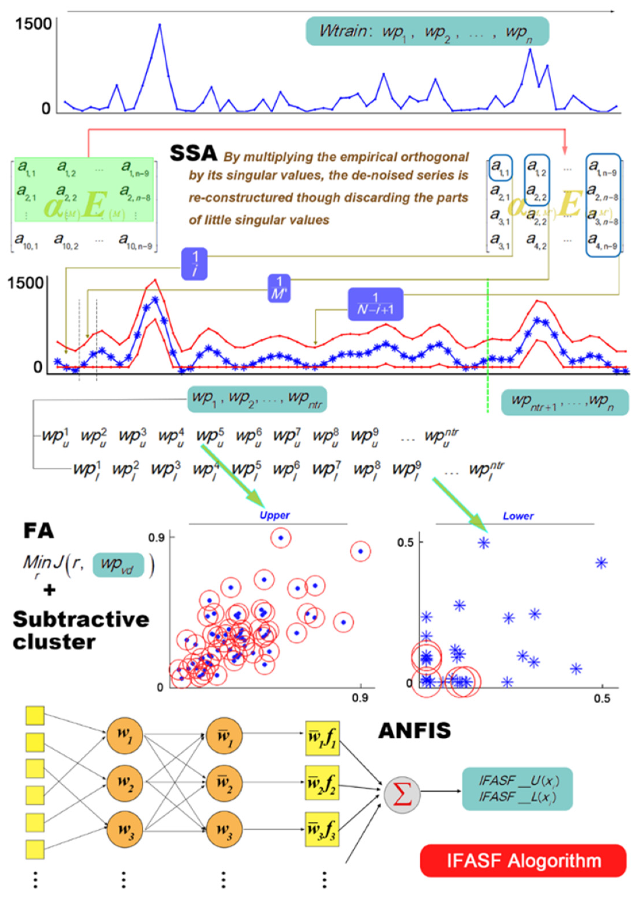 This paper directly outputs interval limits by training upper or lower limits of historic wind power values by a hybrid model of SSA [27], ANFIS [28], FA [29] and an Interval Forecast (IF) [20]. All of these four models will be summarized in this section, and the detailed information of the hybrid model is presented in Section 3. To avoid symbol confusion in these four methods, the parameters are listed in Table 1.