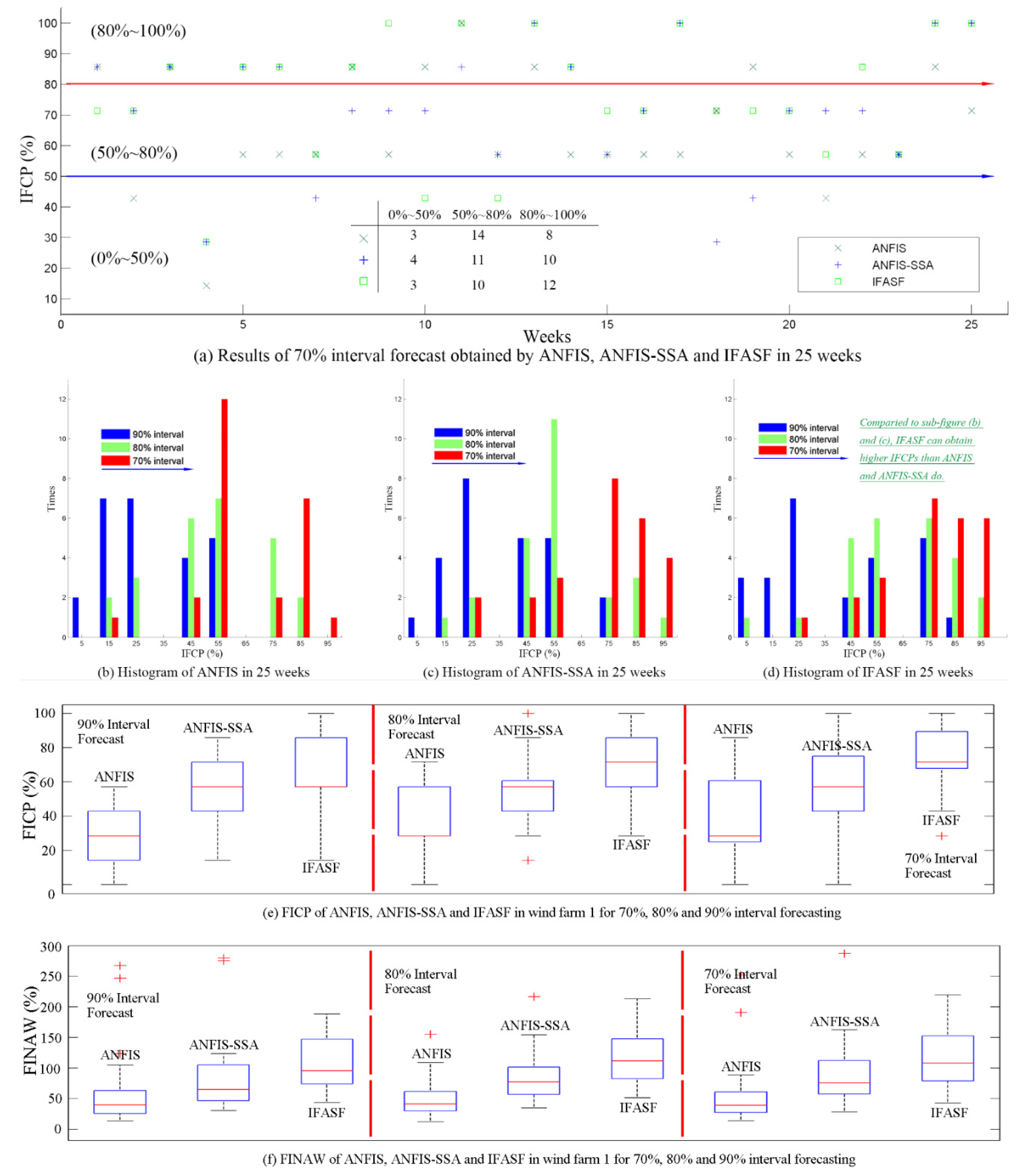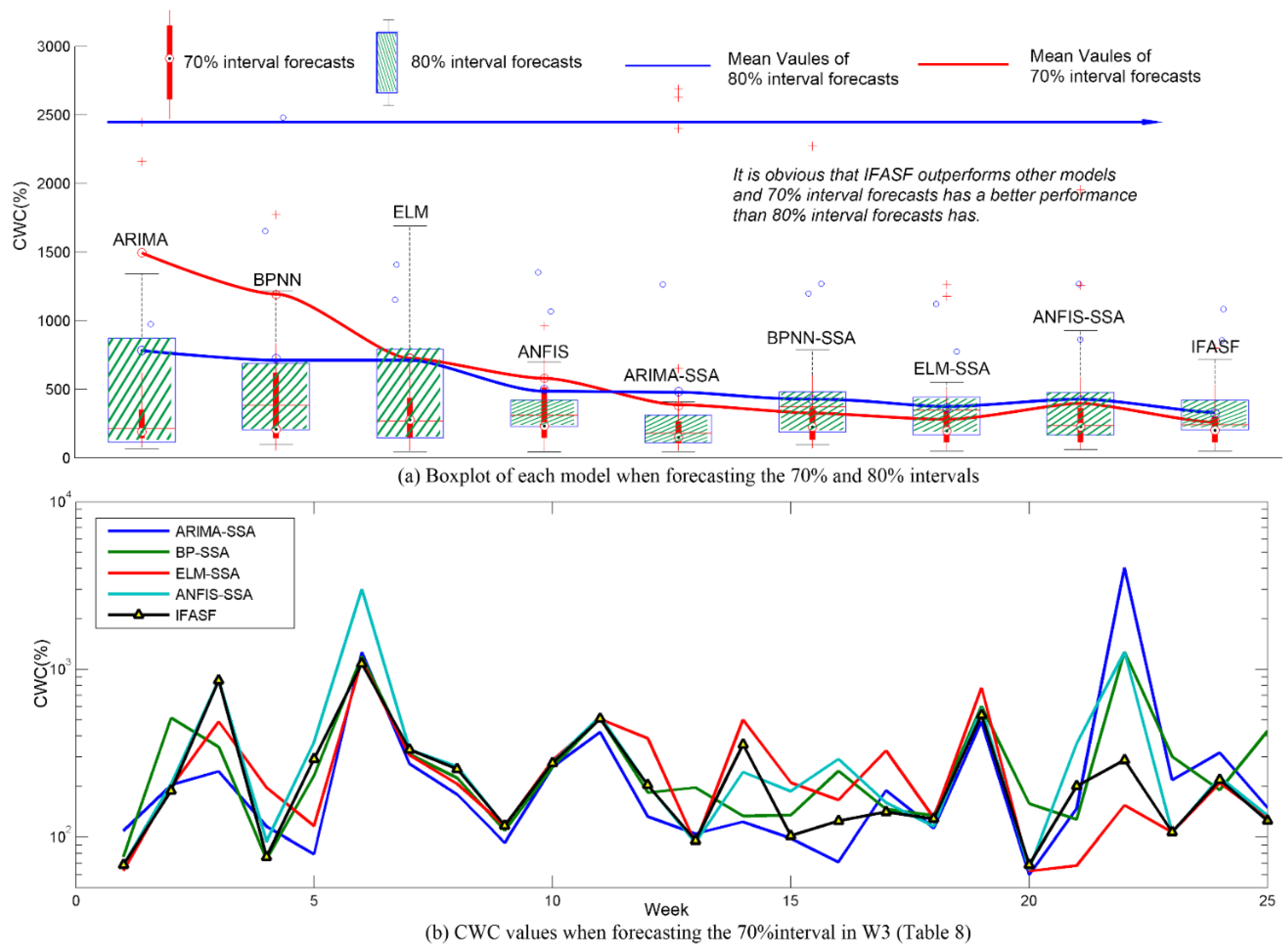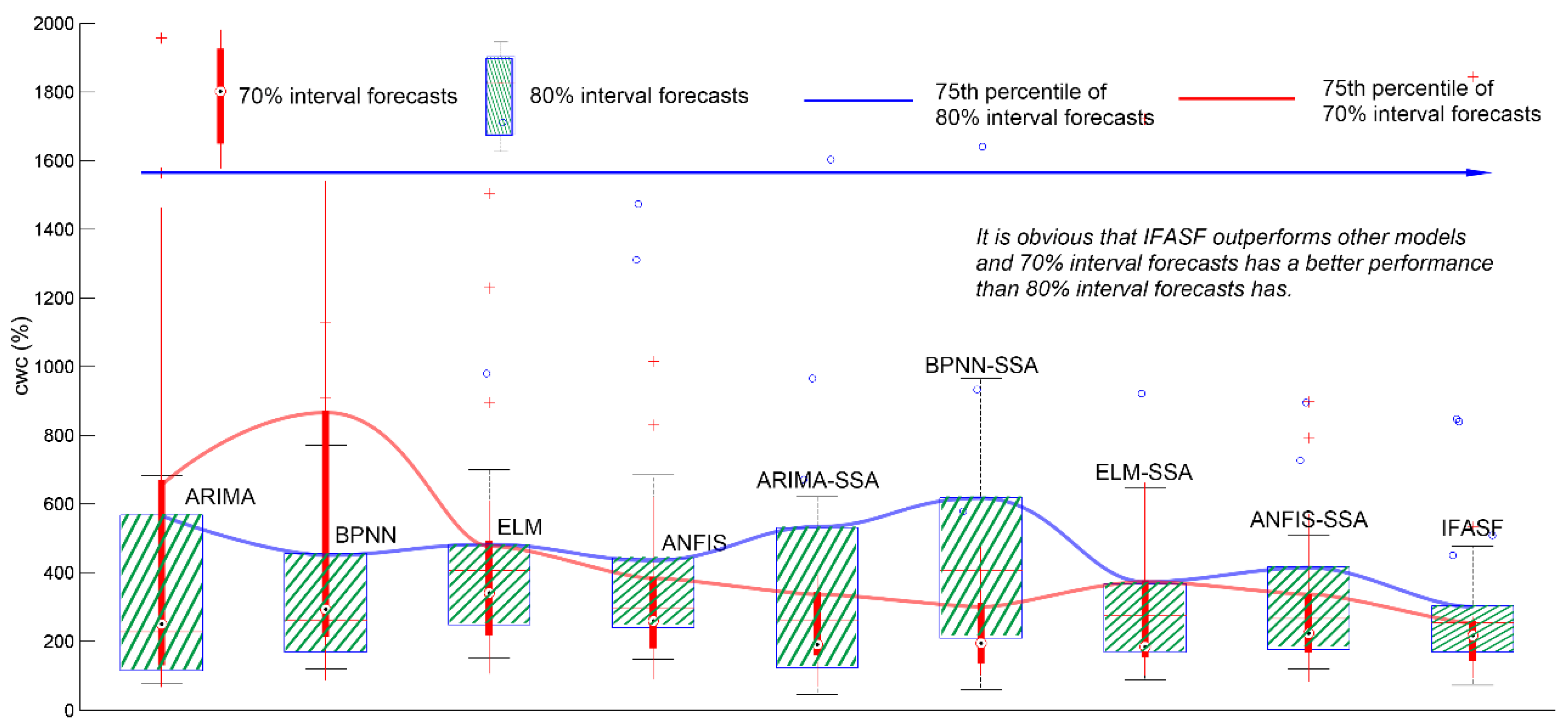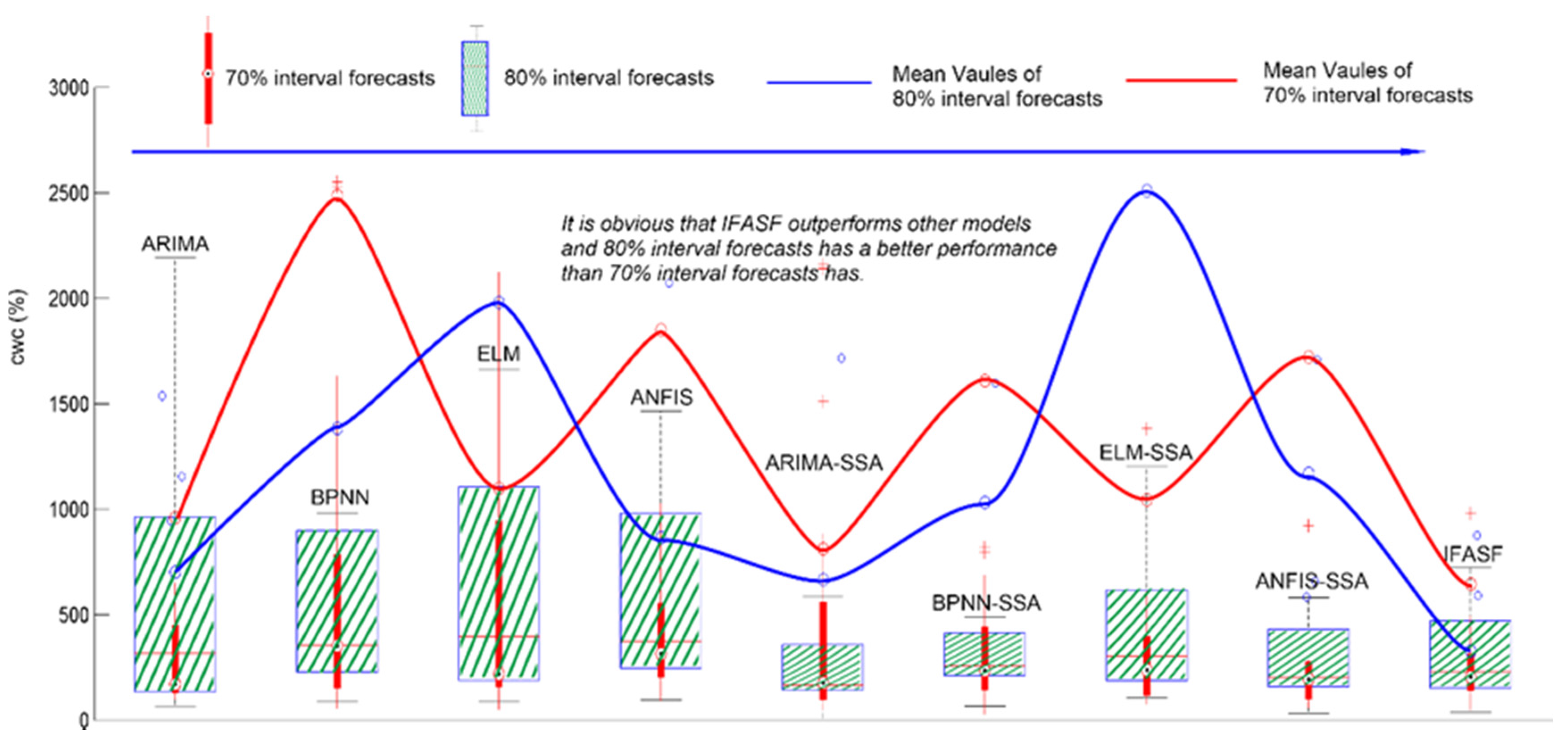 Nevertheless, no matter which model (basic models or models pre-progressed by SSA) is considered, the IFASF model still is the best interval forecasting model when forecasting the 70% and 80% wind power intervals. In Figure 12a, which presents a boxplot of each model when forecasting the 70% and 80% intervals, the blue line represents the mean CWC of the 80% interval forecasts, and the red line represents the mean CWC of the 70% interval forecasts. From the perspective of the models’ forecasting effectiveness, IFASF apparently outperforms the other models. Thus, from the above analysis of forecasting results, the developed model, IFASF, is the best interval forecasting model for the mean wind power points in the W3 wind farm.