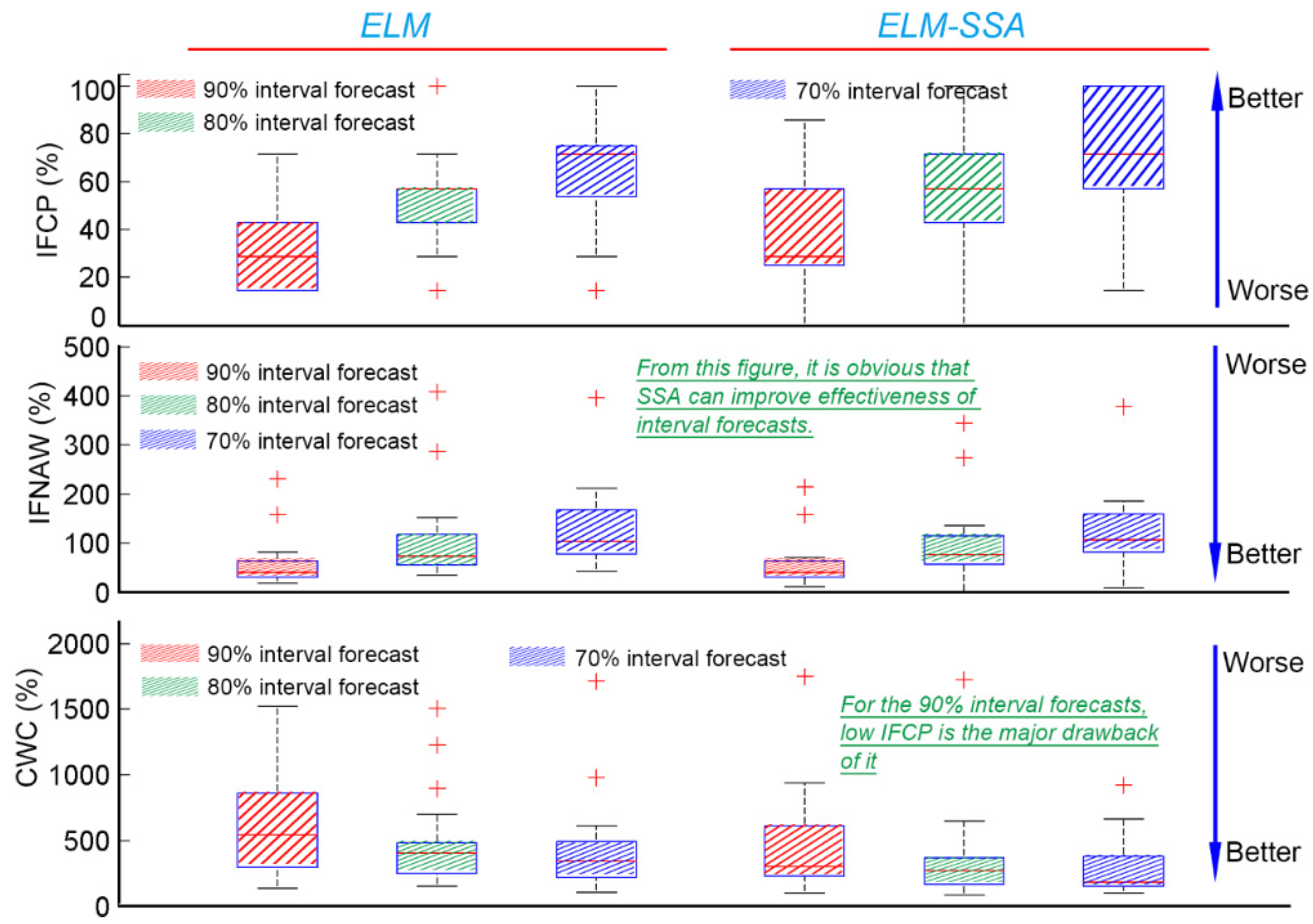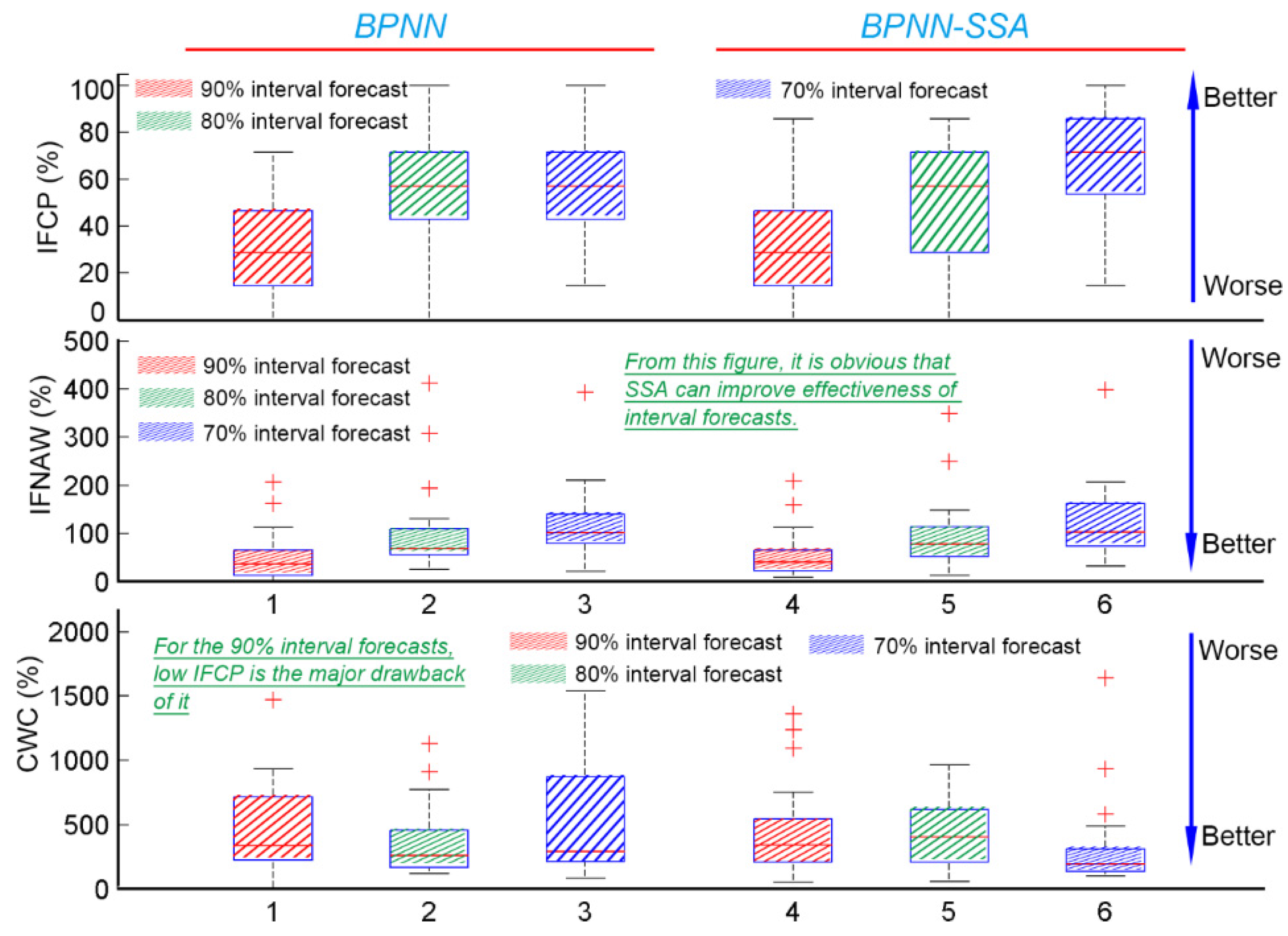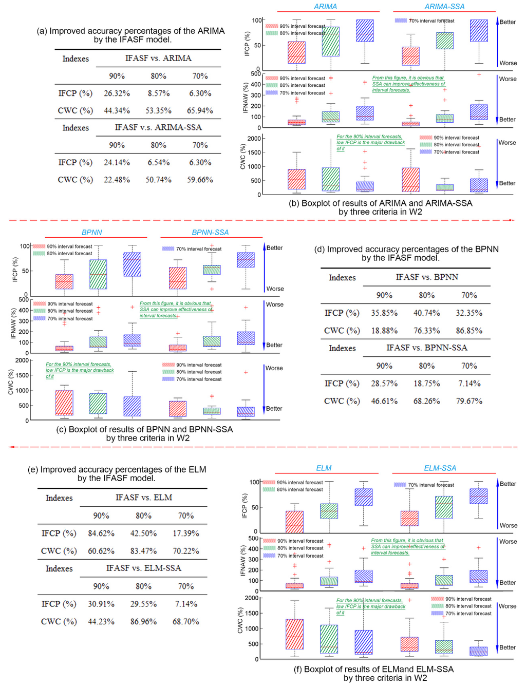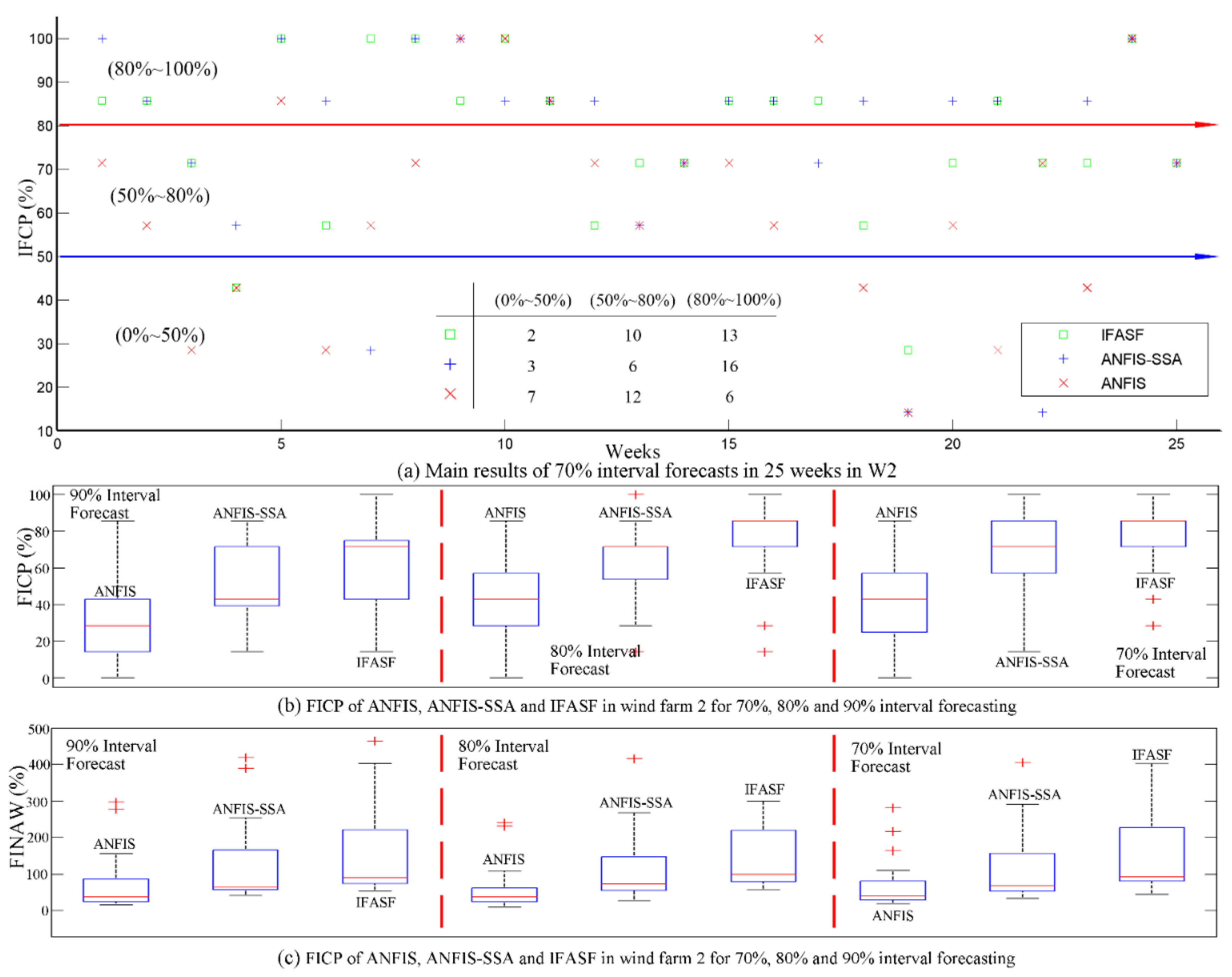 Nevertheless, no matter which model (basic models or models pre-progressed by SSA) is considered, the IFASF model still is the best interval forecasting model when forecasting the 70% and 80% wind power intervals. In Figure 12a, which presents a boxplot of each model when forecasting the 70% and 80% intervals, the blue line represents the mean CWC of the 80% interval forecasts, and the red line represents the mean CWC of the 70% interval forecasts. From the perspective of the models’ forecasting effectiveness, IFASF apparently outperforms the other models. Thus, from the above analysis of forecasting results, the developed model, IFASF, is the best interval forecasting model for the mean wind power points in the W3 wind farm.
