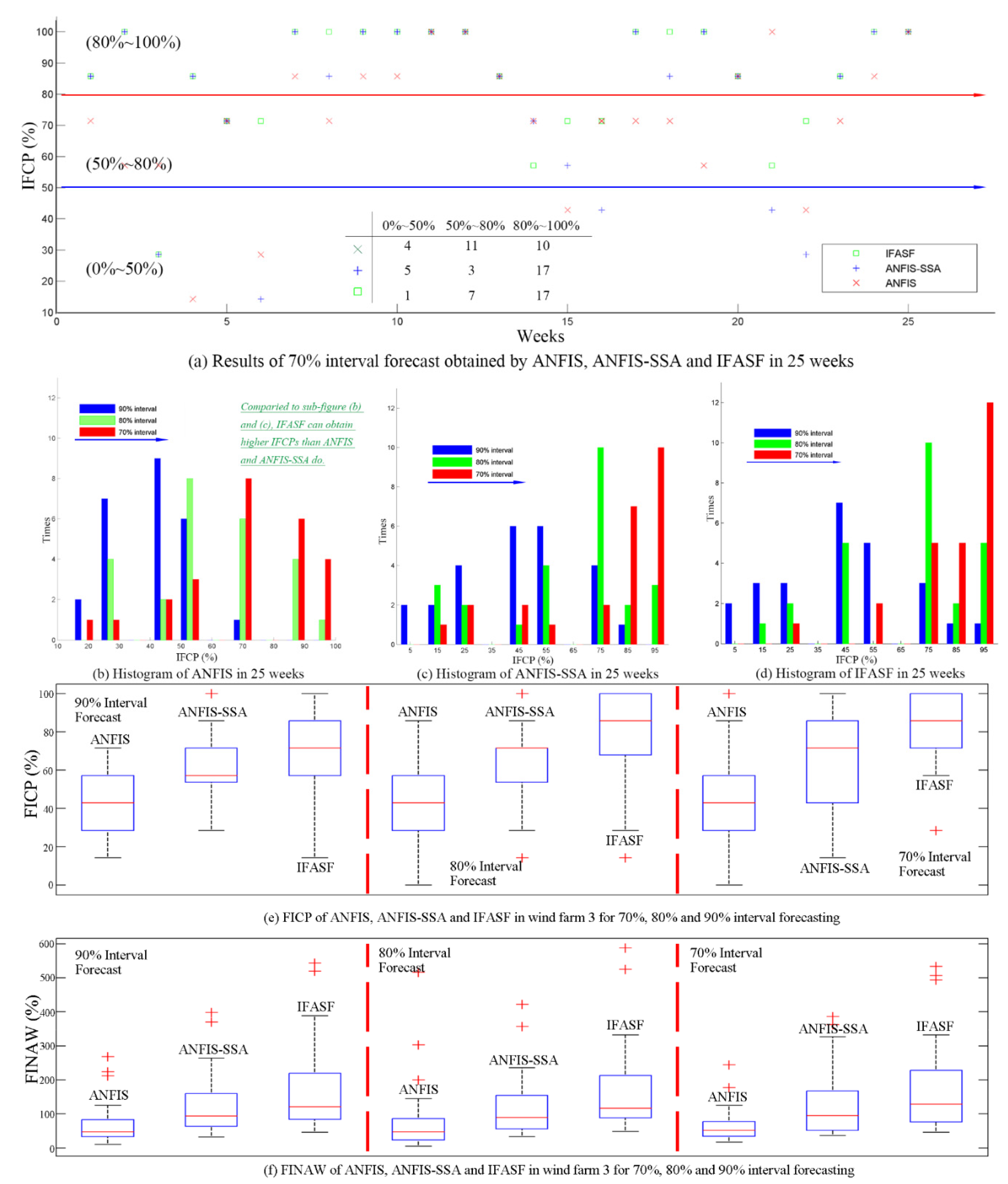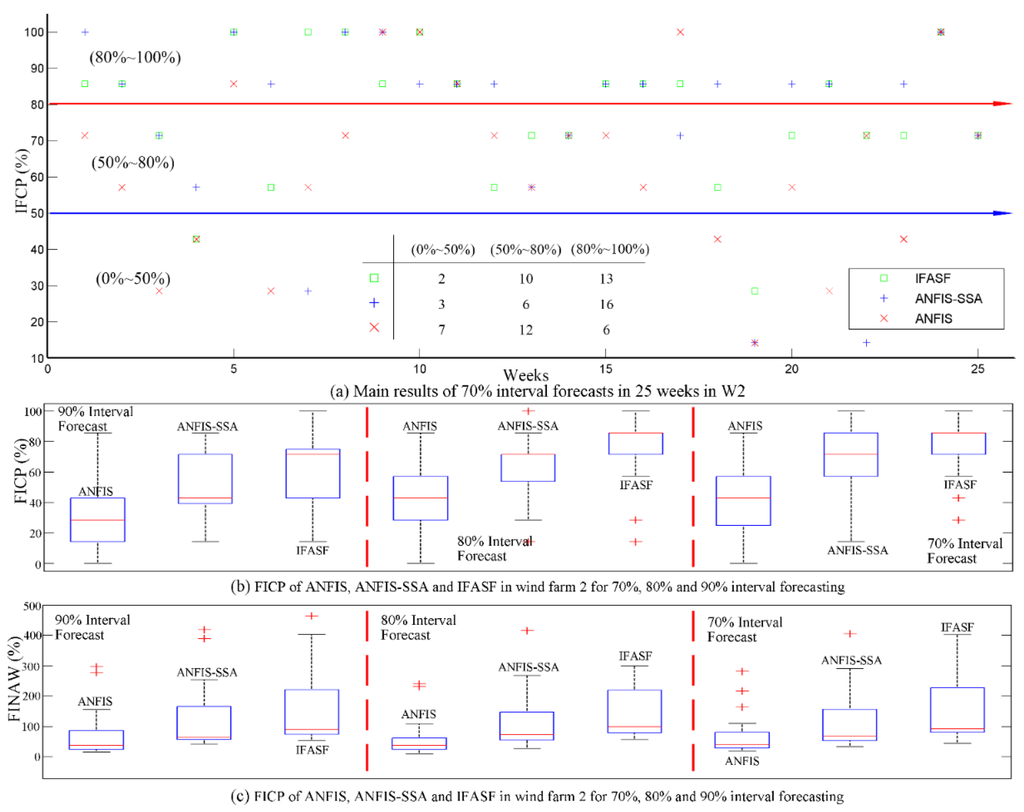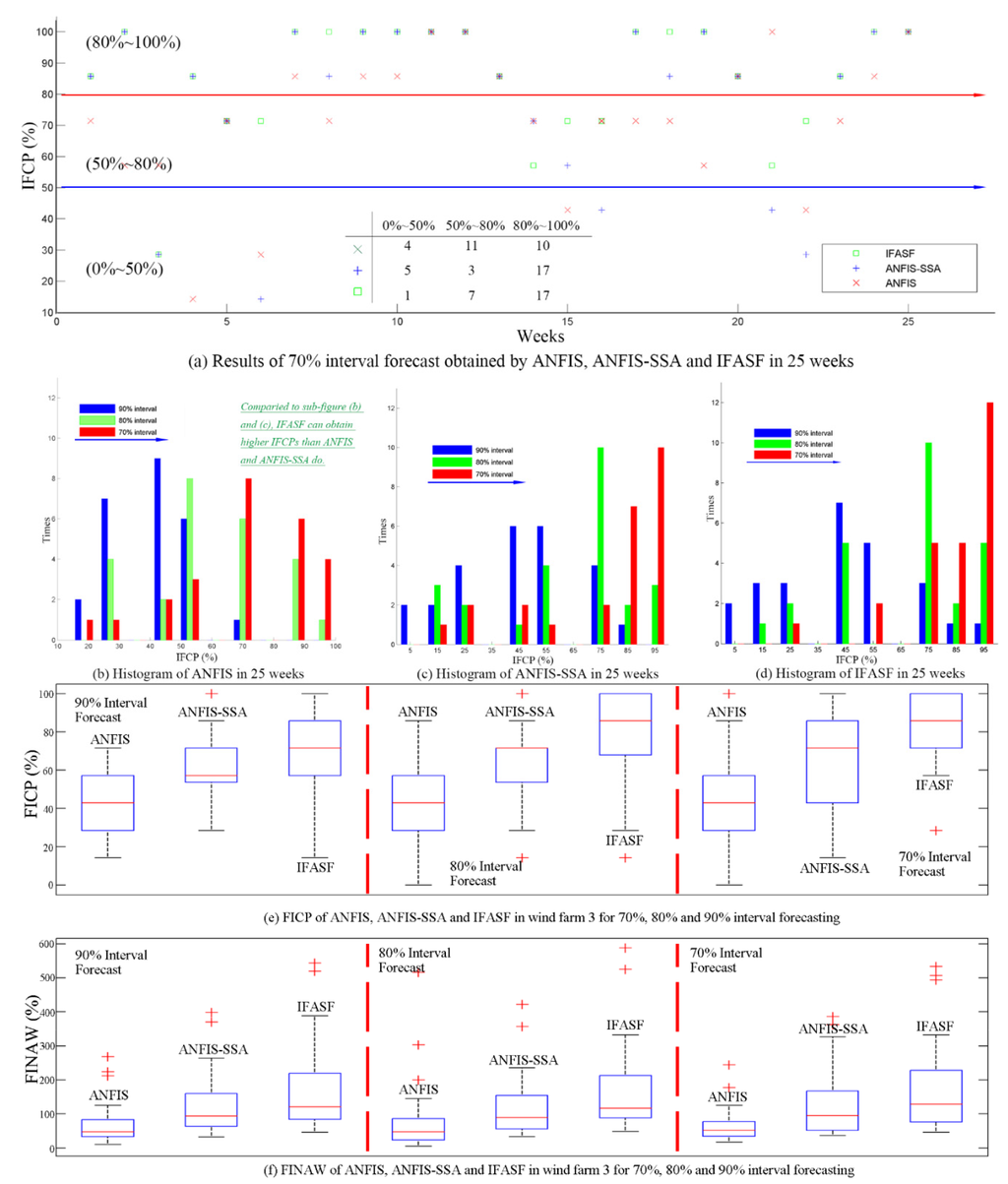 From Table 10, it can be seen that IFASF still outperforms other benchmarks by comparing CWC and the 90% interval forecasts have better performance than 80% and 70% interval forecasts in W2 and W3. The results show that the proposed model not only has a good performance of interval forecasts of daily average wind powers but also is suitable for six-hour average wind power, indicating that FA and SSA are effective for improving forecasting accuracy and can be used to optimize ANFIS to forecast the wind power’s interval for different time horizons.