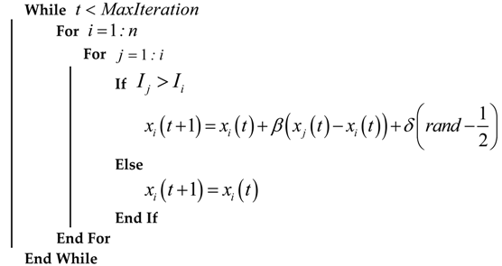 The firefly algorithm (FA), developed by Xin-she Tang [], is enlightened by the natural behaviors of the firefly. A firefly moves together with other partners because of its tendency to move toward a brighter flash, which is determined by the light intensity of the other fireflies and the distance between them. Assuming three idealized rules are established [], FA can be summarized as follows.