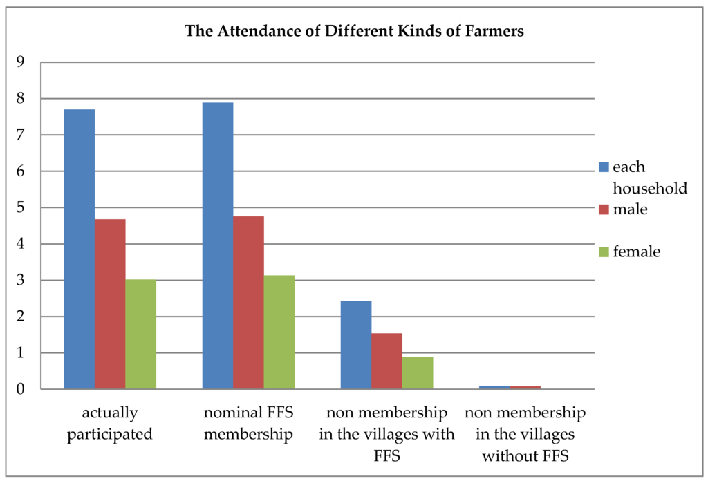 Figure 1 presents the FFS attendance rate by these three groups of farmers. For farmers who actually participated in the FFS training, on average, each household attends 7.7 sessions, of which the male member attends 4.68 sessions, and the female member attends the remainder. The attendance rate is approximately 55% (7.7/14). For all three groups, the attendance rates for male farmers are higher than those of the female farmers. The attendance rate of group (1) farmers is much higher than that of the other two groups: 56.4% (7.89/14)