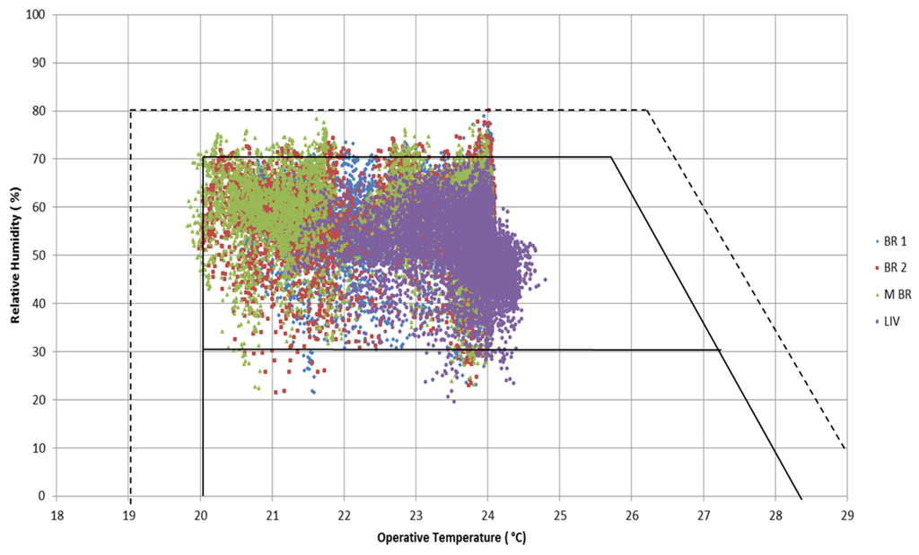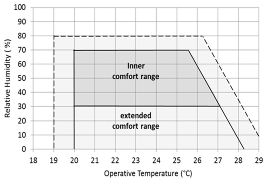PMV and PPD indices are the most commonly parameters used to estimate thermal sensation in the built environment. The ASHRAE and ISO thermal sensation seven point scales are used to predict the comfort vote. The scale represents the following votes; (−3) cold, (−2) cool, (−1) slightly cool, (0) neutral, (+1) slightly warm, (+2) warm and (+3) hot. A number of building simulation tools makes use of these scales to measure thermal comfort, such as IES, ESP-r, TRNSYS and IDA Ice [17]. In addition, thermal comfort has been assessed in simplified approaches as an expression of two variables—air temperature and relative humidity. Graphical representations can presents thermal comfort as a combination of acceptable temperatures and relative humidities, examples being Olgyay’s bioclimatic chart and Givoni’s building bioclimatic chart [18]. A similar graphical approach is used by the Passivhaus Institute (referred to as Schneider’s comfort chart in this article) to assess thermal comfort in occupied spaces (see Figure 1). The annual hourly operative temperatures and associated relative humidity levels are plotted against each other. A central shaded area represents the inner comfort zone, with a range of operative temperatures between 20.0 and 25.5 °C, and 70% relative humidity as the upper limit. An extended comfort zone is also included to allow for an additional increase in indoor operative temperatures [19].