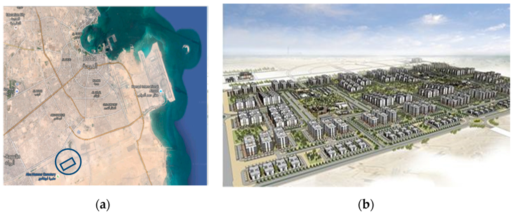 Qatar’s Passivhaus project is located within a new development (Barwa city) situated 18 km south-west of the capital Doha—see Figure 2a,b. The 1.35 million square metre development provides a sustainable living style for a community of over 25,000 people, with all necessary amenities, such as schools, retail outlets, bank, health centre and mosques [33,34].