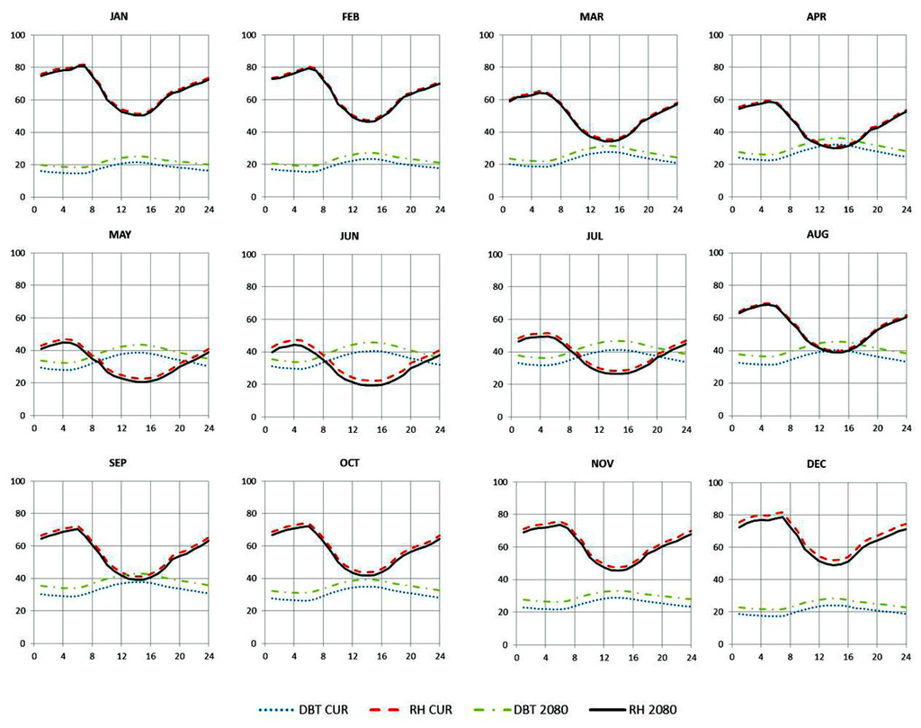 Current and future hourly dry bulb air temperature and relative humidity for Doha.