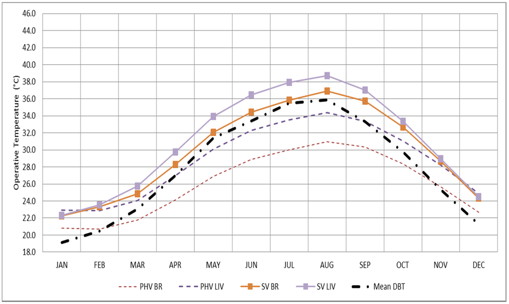 The TEP was assessed by examining the operative temperatures in the living/dining space (LIV) and one of the bedroom spaces (BR) in the PHV and STV while mechanical cooling was switched off. This provided an assessment of the thermal envelope’s efficiency in the PHV and the high level of insulation incorporated in to its design. The results are displayed in Figure 5 and Figure 6. Figure 5 shows the present time mean monthly operative temperatures and mean outdoor dry bulb temperature (DBT) for the standard and Passivhaus villas. Figure 6 displays the same parameters for the future weather scenario.