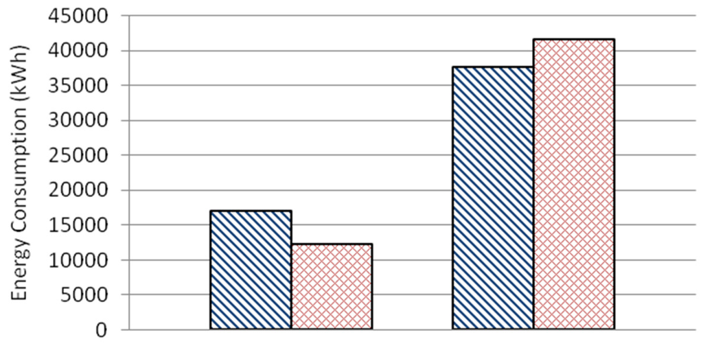 The Passivhaus standard requires that the total annual primary energy demand should not exceed 120 kWh/m2. According to simulation results and on-site measurements the full load of the Passivhaus villa PHV is met by the PV generated energy (Figure 9). The PHV’s energy consumption without utilizing the energy generated through the PV array was compared against the STV. The simulated outcomes indicated that the PHV would consume around half the energy used in the standard villa, both for the present time and in 2080 (Figure 9). The interpolation of the existing measured three meter readings indicated even better results, with the PHV using around a third of the energy used in the STV. This trend was similarly found in the most dominant load, the cooling load. Statistical analysis conducted on the on-site data indicated that the STV requires three times more energy to be cooled to a set point temperature of 23.5 °C compared to the PHV’s requirements.