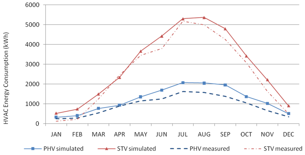 Annual heating, ventilating and air conditioning (HVAC) energy consumption—measured and IES simulated for current weather data.