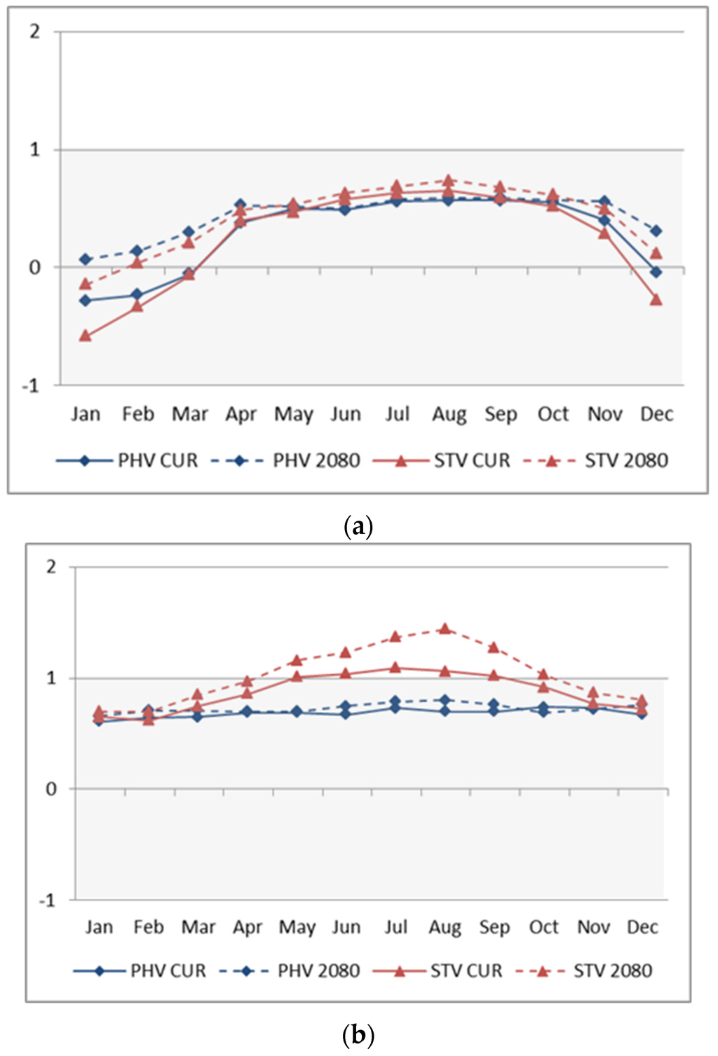 Figure 10a,b show the average and maximum PMV respectively for the present and future scenarios in the two villas. Figure 11, Figure 12, Figure 13 and Figure 14 show the annual hourly relative humidity v. operative temperatures plots (Schneider comfort charts) for the standard villa STV and the Passivhaus villa PHV for both current and future weather scenarios.