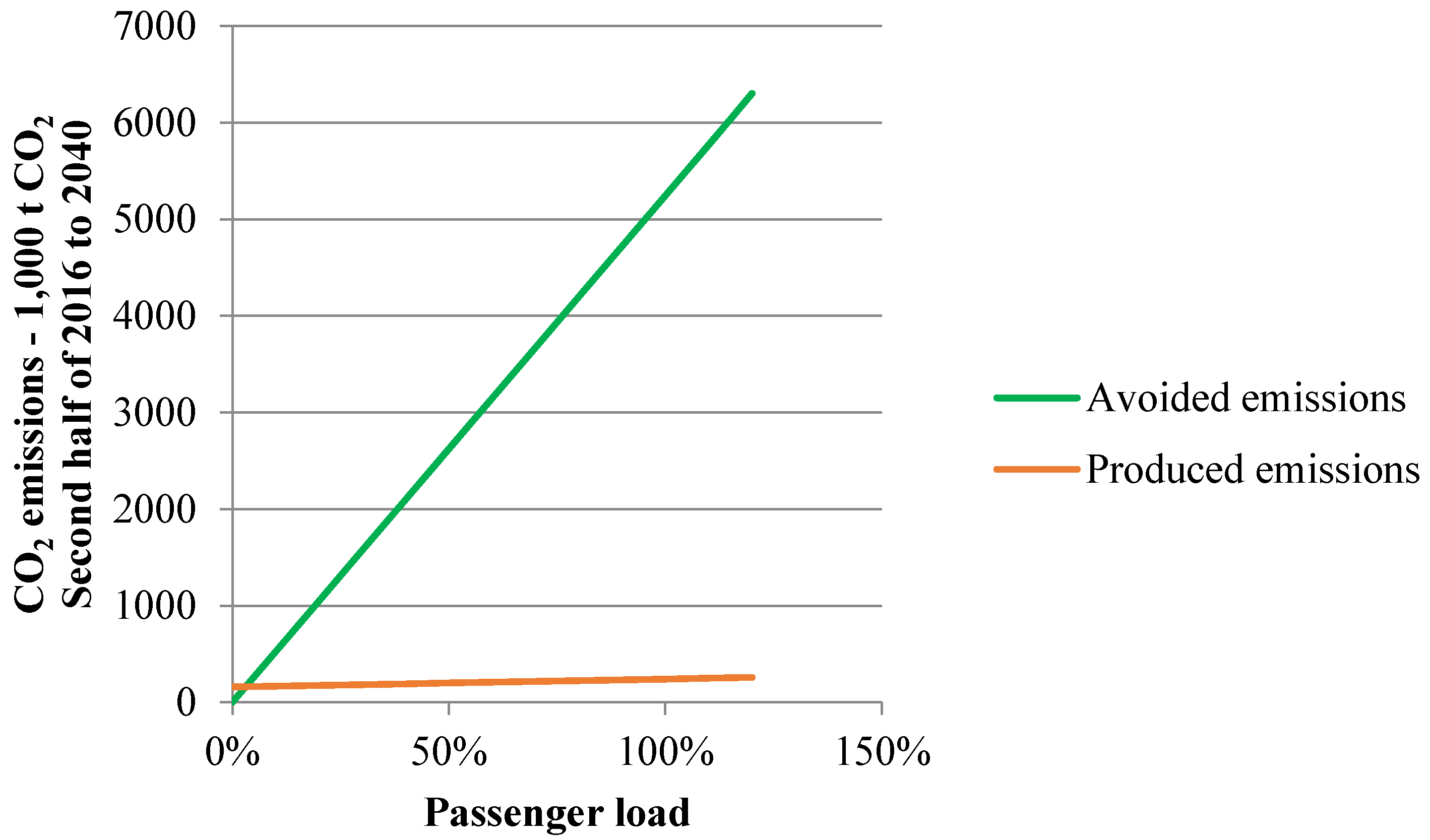Figure 2. It can be seen that as passenger load increases, avoided emissions increase more than produced emissions. This is a crucial parameter. While produced emissions grow, but remain below 300 thousand t CO