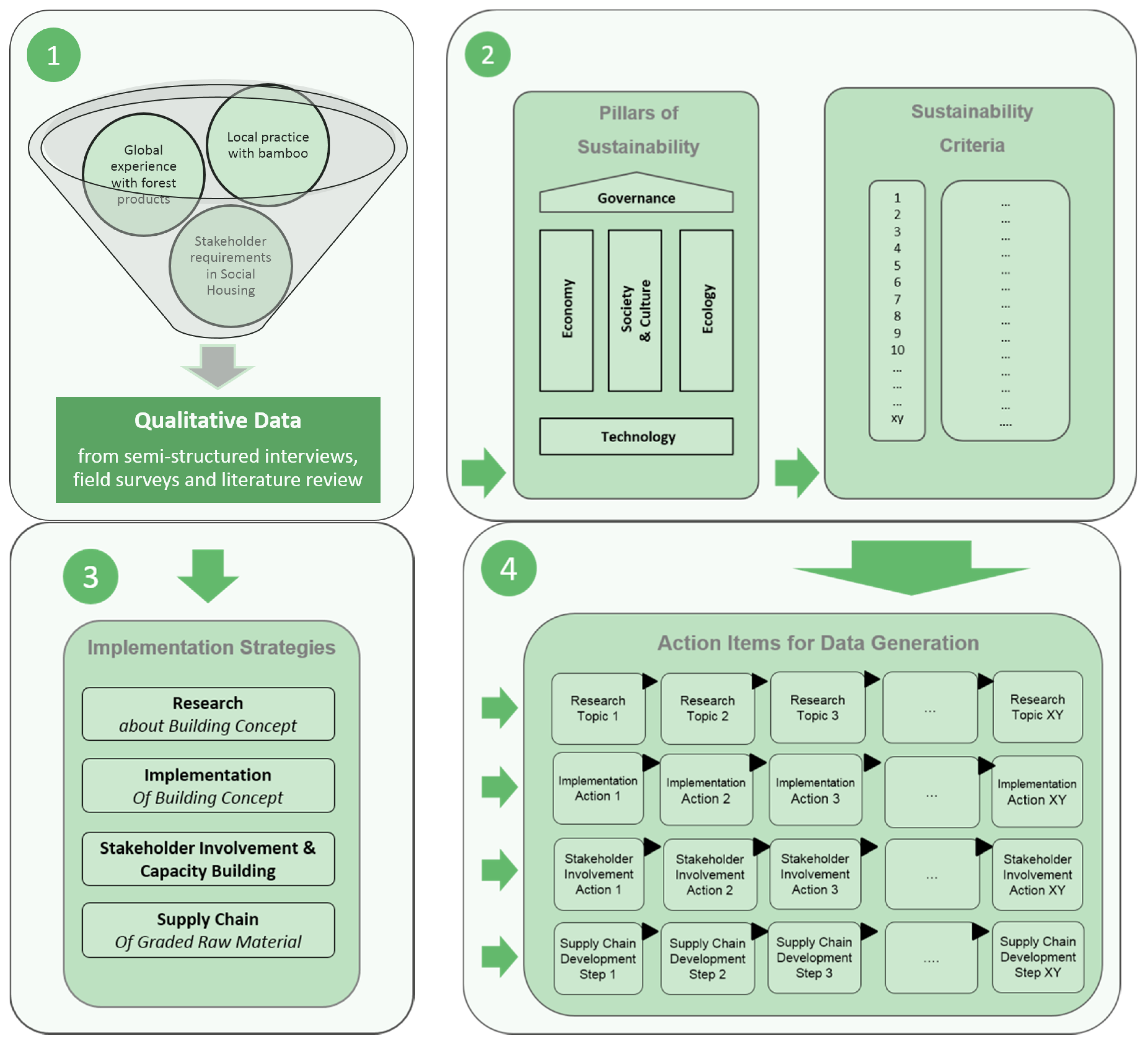 In order for action items to become measurable, a method for implementation has to be allocated. [32] identified that a systematic and transparent selection of the method is still subject to further research. Through segmentation of the complex problem Use of bamboo for social housing into action items, the paper is able to identify individual one-dimensional methods per action item leading to measurable endpoints. In this way, qualitative stakeholder data can be translated into quantitative methods for data generation. The choice of quantitative methods for data generation was determined by scientific quality and context related suitability. The combination of one-dimensional result into a mid-point, multi-criteria, or pareto result such as in [12,29,51,28] still remains a topic for further research. However, the pathway for a holistic assessment of the technologies is created.