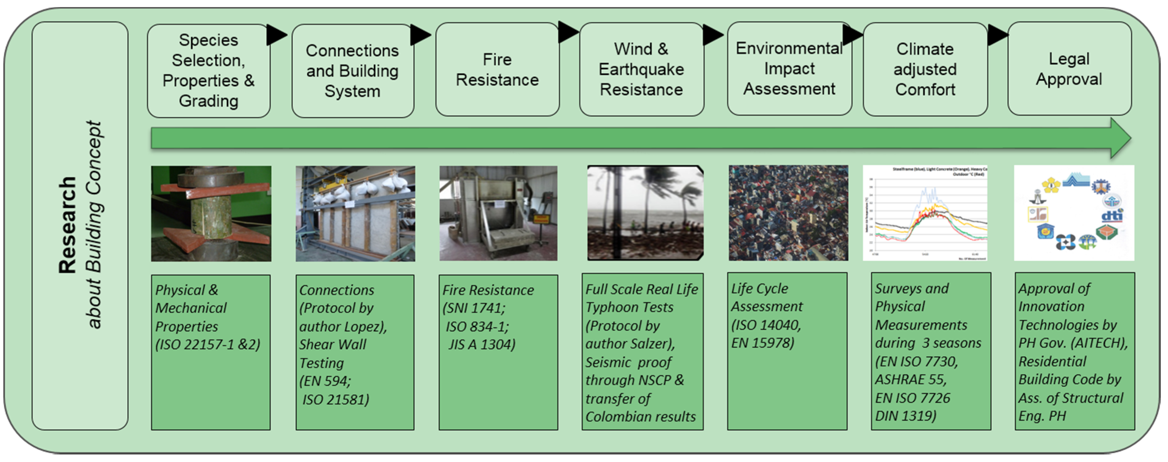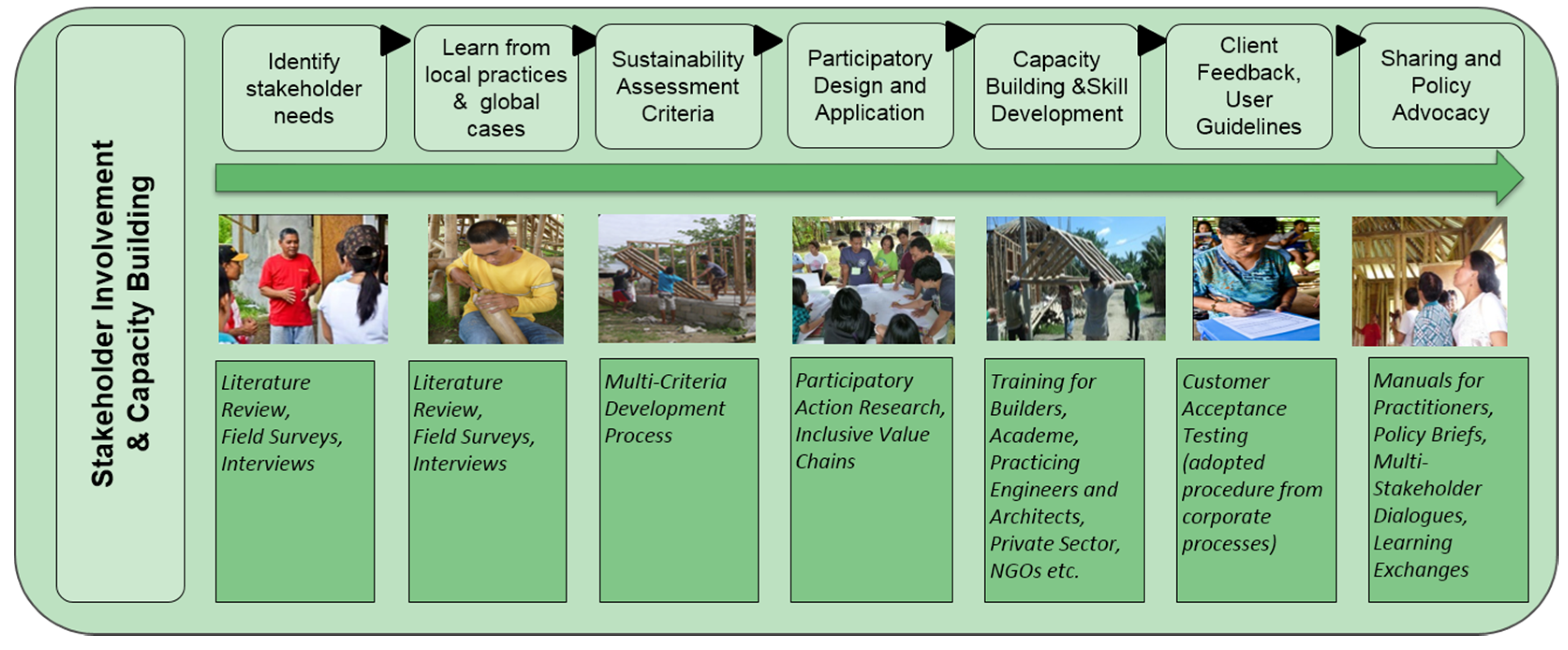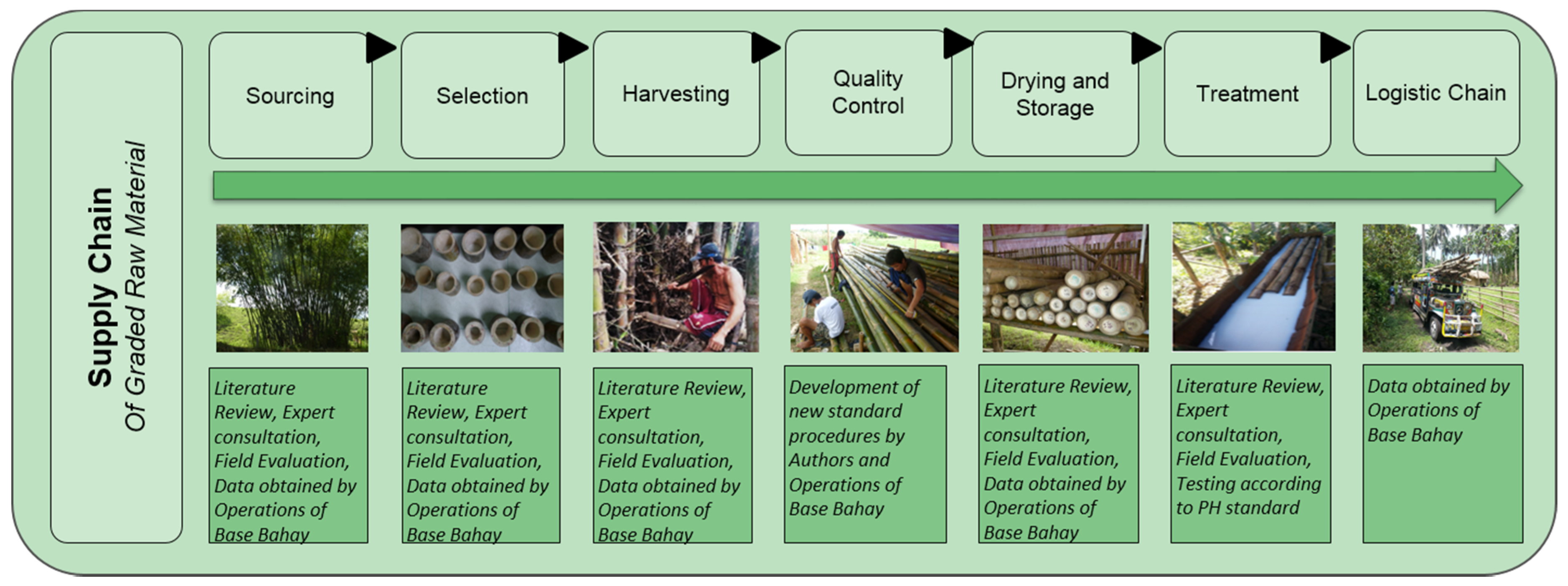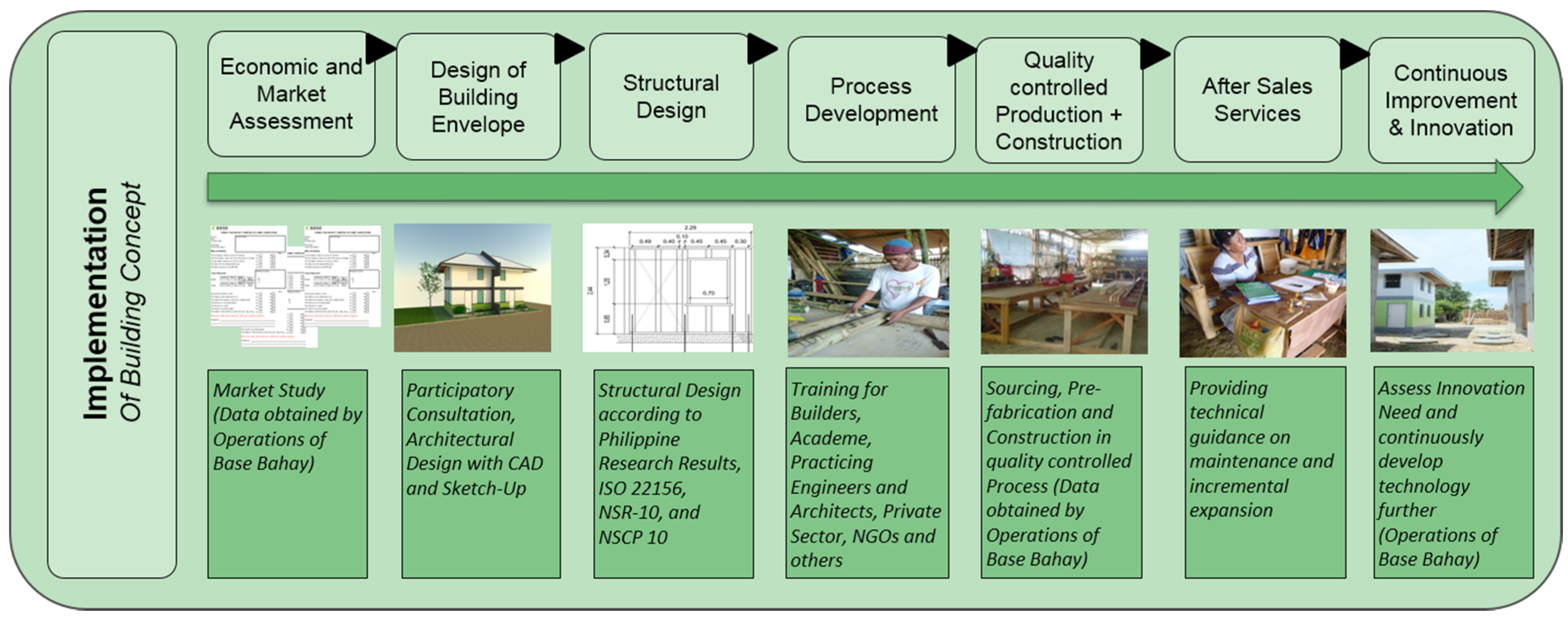 The core development consists of research about and implementation of the technology. The importance of developing a technology people-centered and along of client’s needs, as introduced earlier, is named critical by numerous literature references [13,34,37] and institutions such as [49]. For the application of a forest product based technology at larger scale, a specific requirement is further a sustainably generated, accessible supply of quality graded raw material. In [50] it is mentioned, that in many economies such a bamboo supply chain has to be built-up first.