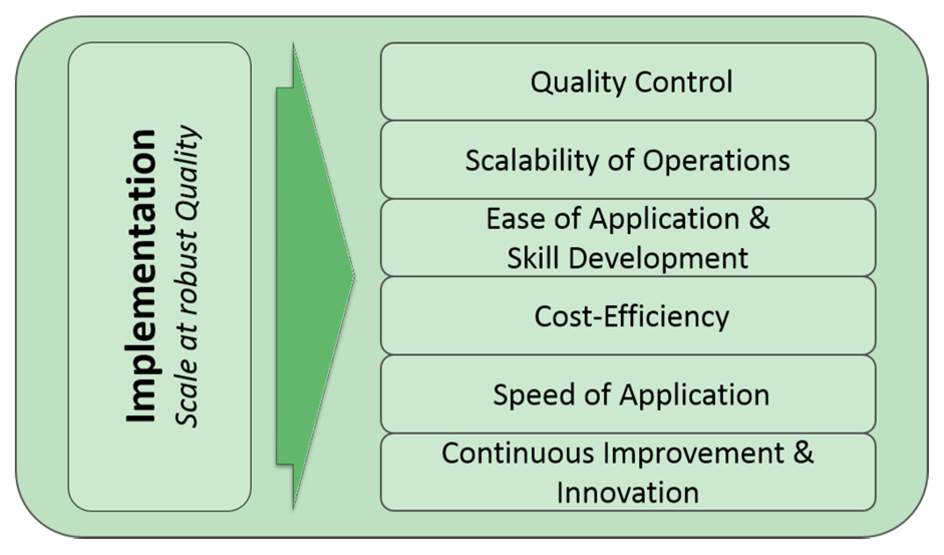 The four Implementation Strategies were then related to the Sustainability Criteria, to identify concrete and implementable action items. As a result, each implementation strategy contains action items across the pillars of sustainability. Figure 2 shows how criteria and implementation strategies are merged into a roadmap naming concrete action and the methods to obtain quantitative data per action: