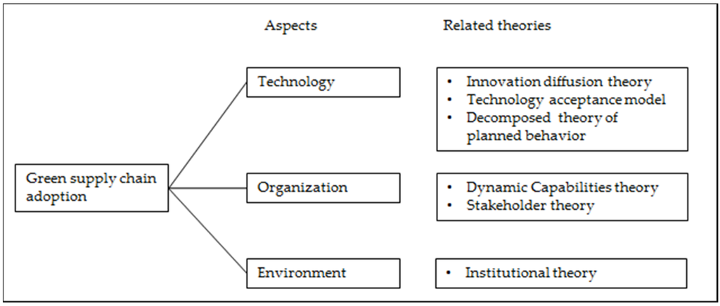 This literature review aims to provide a clear background for green supply chains and a solid research framework for a decision model of green supply chain adoption. The review begins by considering the definition and scope of green supply chains and the theoretical underpinnings of the TOE framework. Subsequently, a comprehensive set of decision factors drawn from different, yet related, theories is explored; these factors situate the decision model in terms of technology, organization and environment. Figure 1 provides an overview of the TOE framework and related theories that will be discussed in this section.