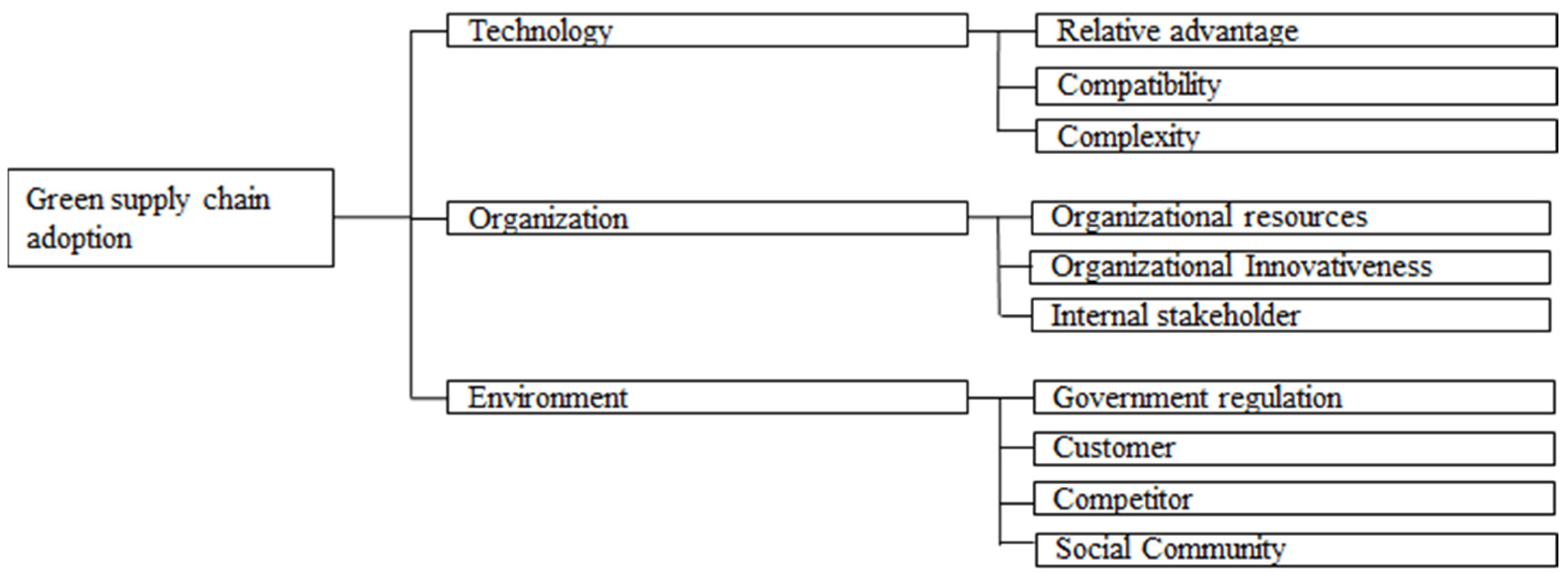 In the literature related to green practices, researchers address a number of reasons why organizations eventually adopt such practices [16,17,18,19,20,21,22]. Most studies address the topic only within organizational and/or external environmental contexts; few do so from a technological perspective [23,24]. Because applying environmental criteria to corporate operations requires exploring new resource combinations, deploying existing resources in new ways, and implementing or modifying processes, techniques, and systems, green supply chain adoption can be regarded as a technical innovation process [25,26]. A theoretical model for innovation adoption needs to consider factors that are rooted in the specific technological, organizational, and environmental contexts of firms [27]. To move beyond the limitations of current research, this study adopts the Technology-Organization -Environment (TOE) framework [28] and adapts it to the adoption of green supply chains; in doing so, it offers a holistic view of and conceptual guidelines for exploring the determinants of green supply chain adoption in the context of the semiconductor industry.