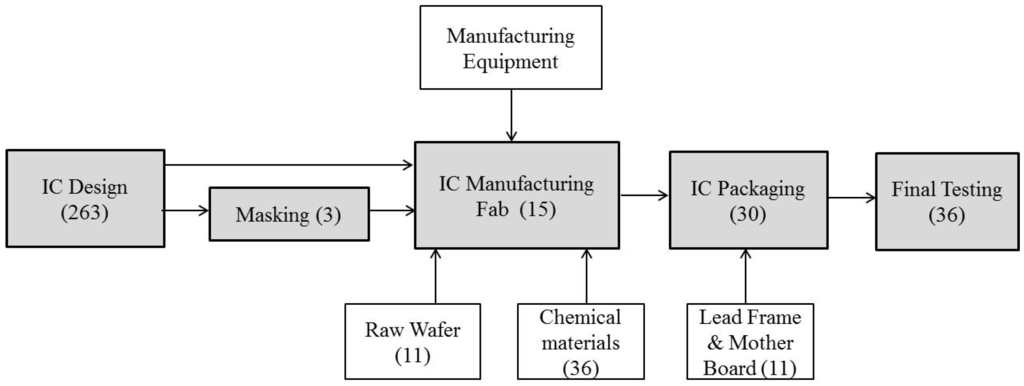 The semiconductor industry in Taiwan is currently the fourth largest in the world, behind only the USA, Japan, and Korea. According to available statistics, Taiwan has become the largest semiconductor foundry manufacturer, the second largest semiconductor designer, and the fourth largest semiconductor producer in the world. In contrast to the vertically integrated conglomerates dominating in Korea and Japan, Taiwan’s semiconductor industry has a unique vertically disintegrated structure that consists of many firms of different sizes specializing in a narrow range of functions, such as IC design, mask production, foundry manufacturing, packaging, and testing [7]. The semiconductor firms in Taiwan are organized as a value chain; they have a strong connection with each other and to global electronics markets. Figure 3 illustrates the major segments that constitute the semiconductor industry supply chain.