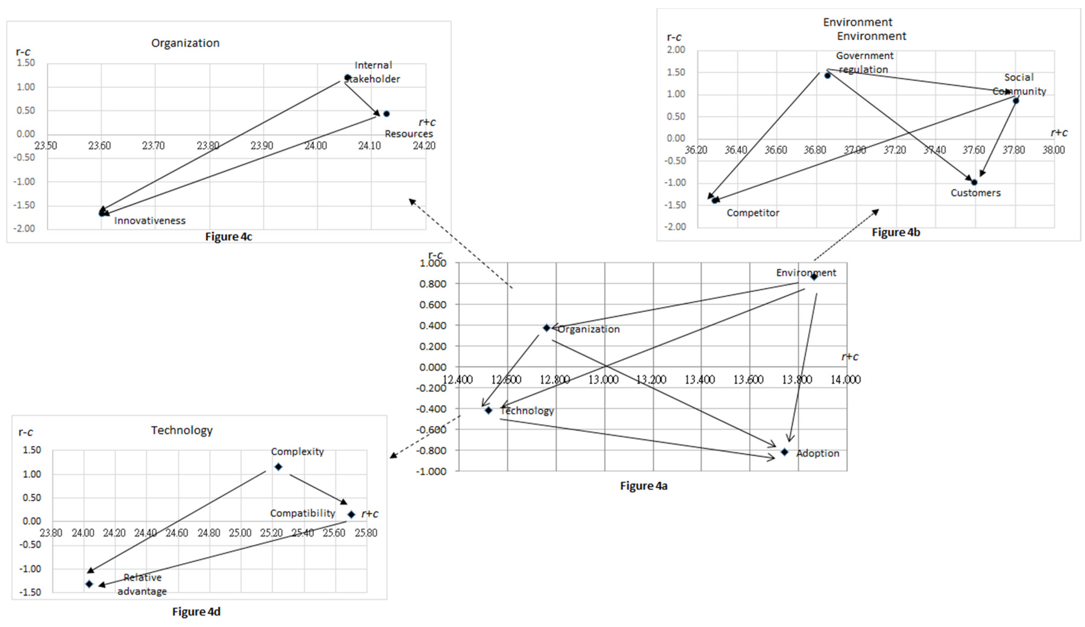 As the purpose of the study was to explore the decision factors and their causal relationships in green supply chain adoption, a fourth aspect, adoption, was added into the DEMATEL calculation as a new aspect. To measure the relationship between factors, we surveyed the experts about the consideration factors’ direct influence on each other by employing pairwise comparison questionnaires (See Appendix A for details). After averaging all the comparison scores, we obtained the initial direct-relation matrix A of the technology, organization, environment and adoption aspects (See Table 2). Based on the initial direct-relation matrix, we continuously normalized these numbers in matrix A by using Equations (2) and (3) to obtain the normalized direct-relation matrix N, as shown in Table 3. Subsequently, we calculated the total relations of the three aspects by using Equation (4). Table 4 presents the resulting matrix T. We then calculated the values “r” and “c,” listed in the right-hand column and the bottom row, respectively, of Table 4, by applying Equations (5) and (6) respectively. Table 5 summarizes the values of r+c (prominence, indicating the influence strength of a context) and r-c (relation, indicating the causal relationship between contexts). In similar fashion, we derived the matrix of the total relations of the factors in each of the three aspects, as presented in Table 6, Table 7 and Table 8 (please refer to Appendix B for details). Finally, applying Equations (5) and (6) again to the factors in the three aspects, we obtained their r+c and r-c values, as summarized in Table 9. A causal diagram can be acquired by mapping the data set (r+c , r-c). Based on the data set shown in Table 5, we obtained Figure 4a, which demonstrates the causal relationships among the aspects of technology, organization, environment and adoption. With the data set in Table 9, we obtained Figure 4b–d demonstrating the causal relationships among the factors within the aspects of environment, organization and technology, respectively.