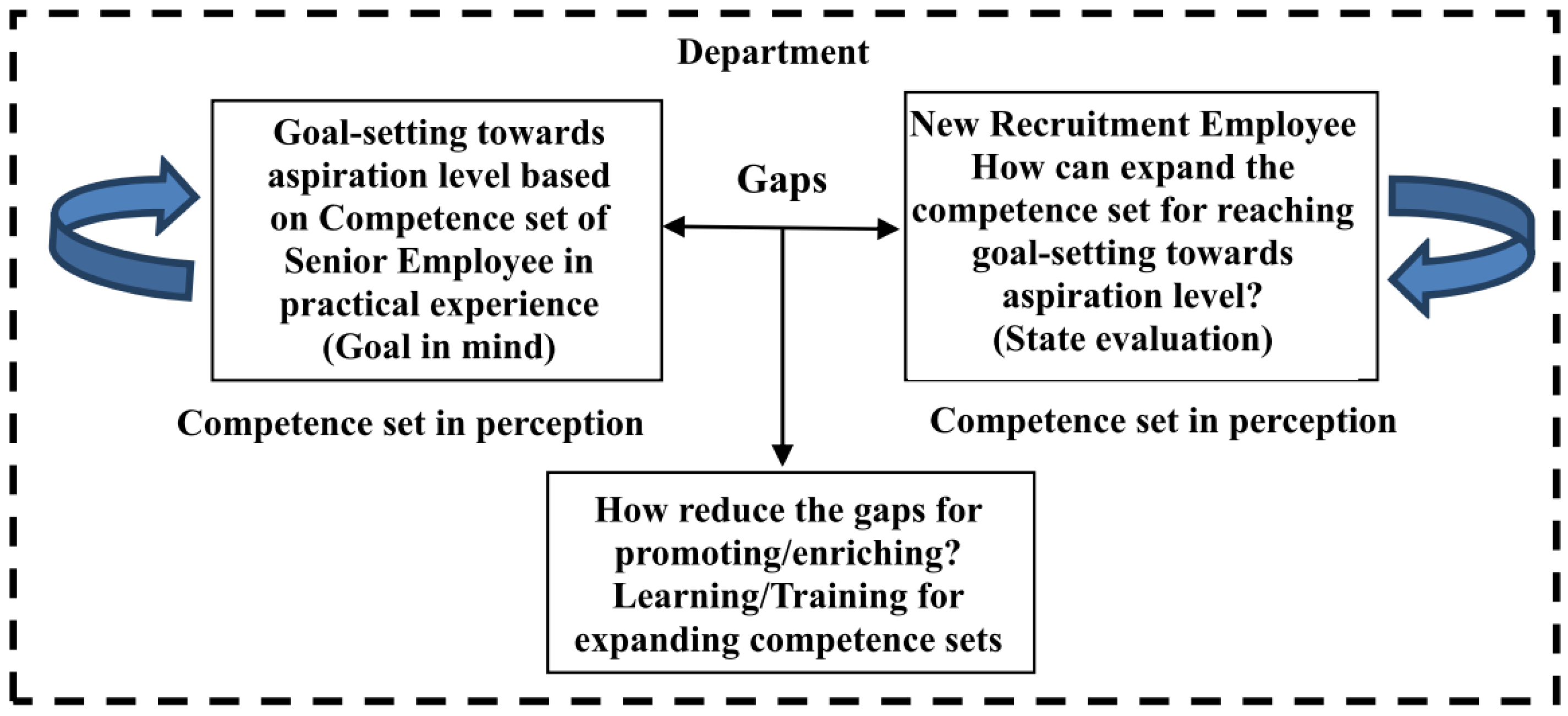 For example, the weakness of competency models in measuring and improving current situations may be structurally rooted in the semantic vagueness, inconsistency, uncertainty/imprecise, and ambiguity of the term competency. How does a group evaluate an abstract term such as insight and obtain consensus? Therefore, how to overcome the gap between the people’s perspective about the competence and how to measure the consistency is the research question of this study. Besides, the variance in different people’s knowledge and perceptions results in gaps and conflict over the precise definition of the term. This occurs when a new employee has not yet improved his or her personal competence set, or when an experienced employee does not know how to assist a new employee in operating efficiently or improving his or her capabilities and expanding his or her original competencies in a competence set with existing perception gaps, as shown as Figure 1.
