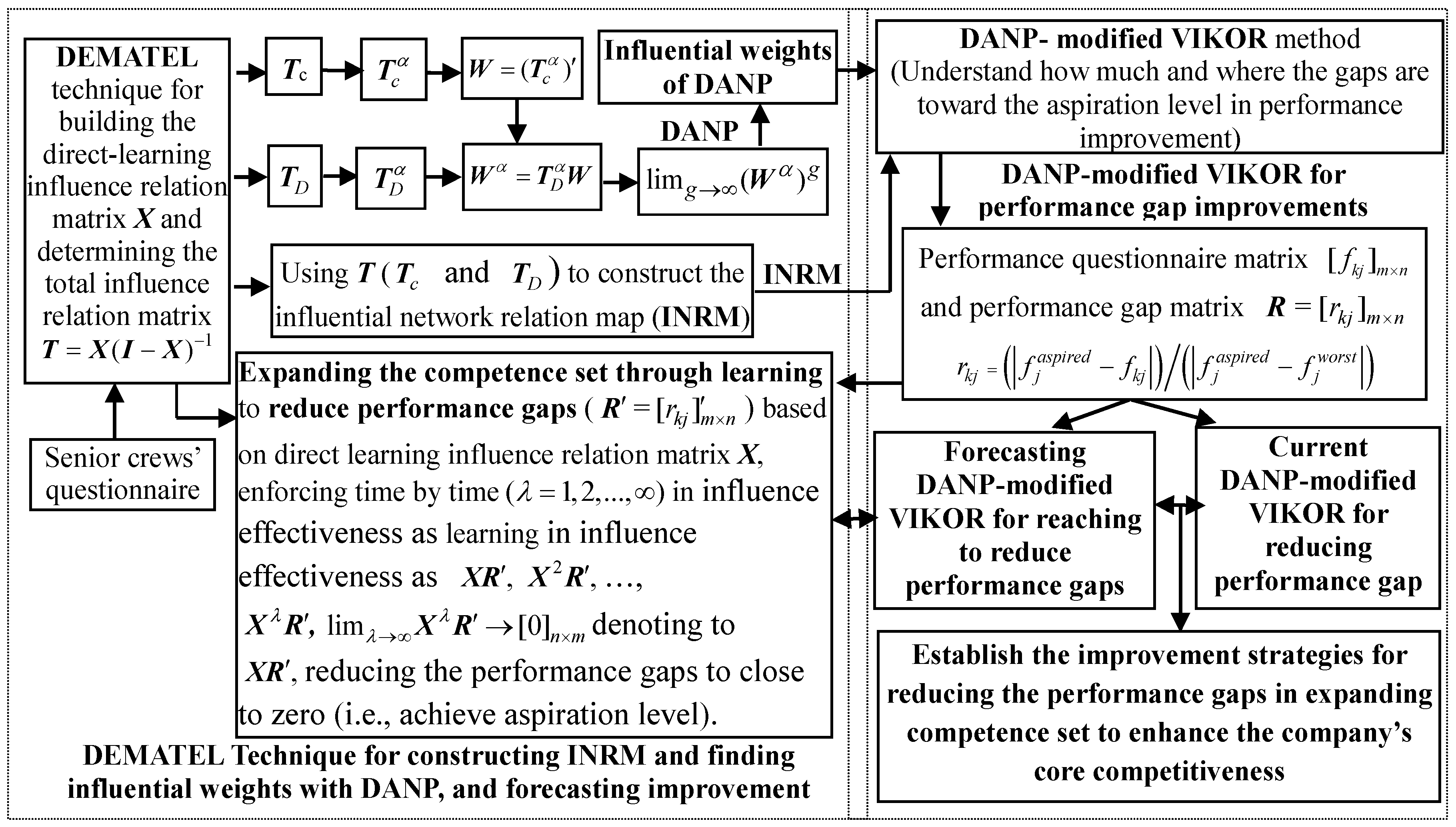 The remainder of this paper is organized as follows. Section 2 reviews the relevant literature on competence sets. Section 3 introduces the influential weights of the DANP and modified VIKOR to establish a new hybrid MADM) model that can provide feedback in interrelationships by using systematics. Section 4 reports the application of the proposed model in an empirical case aimed at enhancing a company’s core competitiveness, the outcomes of which are analyzed and discussed. Finally, conclusions and remarks are presented in Section 5.