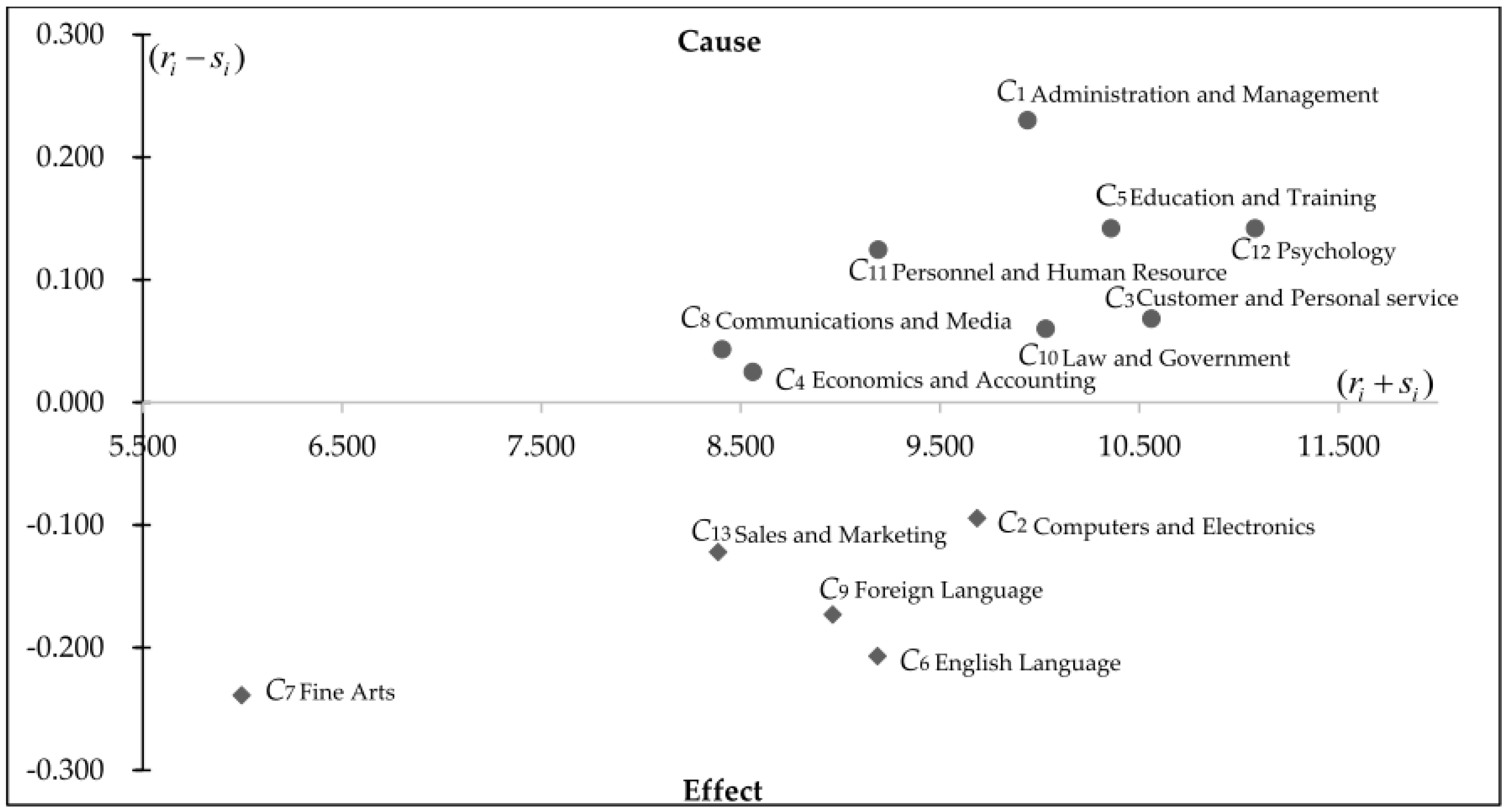 As shown in Table 5, we obtained the INRM (Figure 5). Figure 5 shows that the of (Administration and Management) was the highest net influence competency, the of (Psychology) showed the largest degree of co-influence competencies, was the greatest co-influence cause in this system, and (Fine Arts) exerted the smallest competency effect. Consequently, we divided the cause and effect competencies into two sets and computed the distance between them.