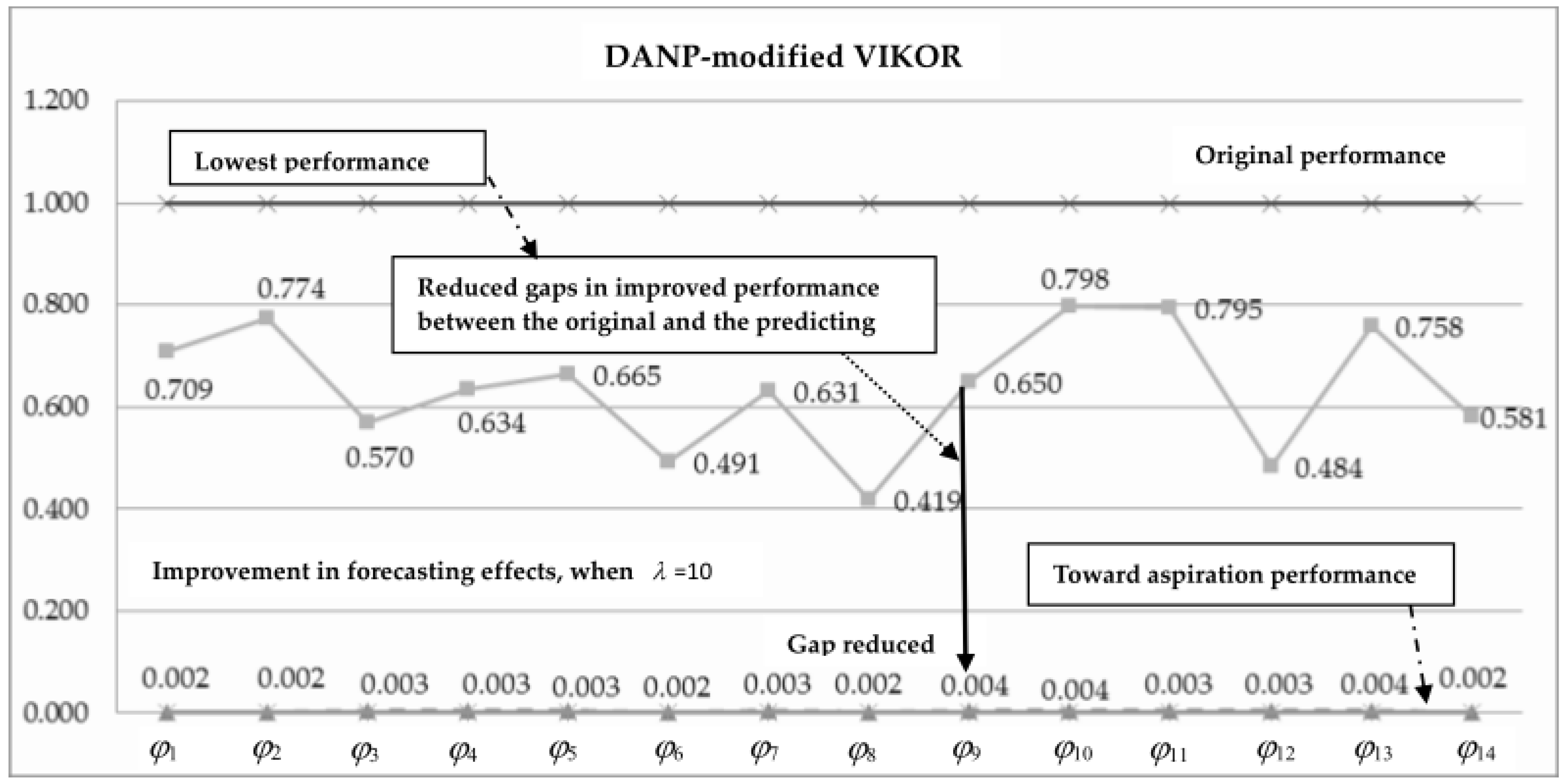 Forecasting performance via the DANP-modified VIKOR improvement learning method.