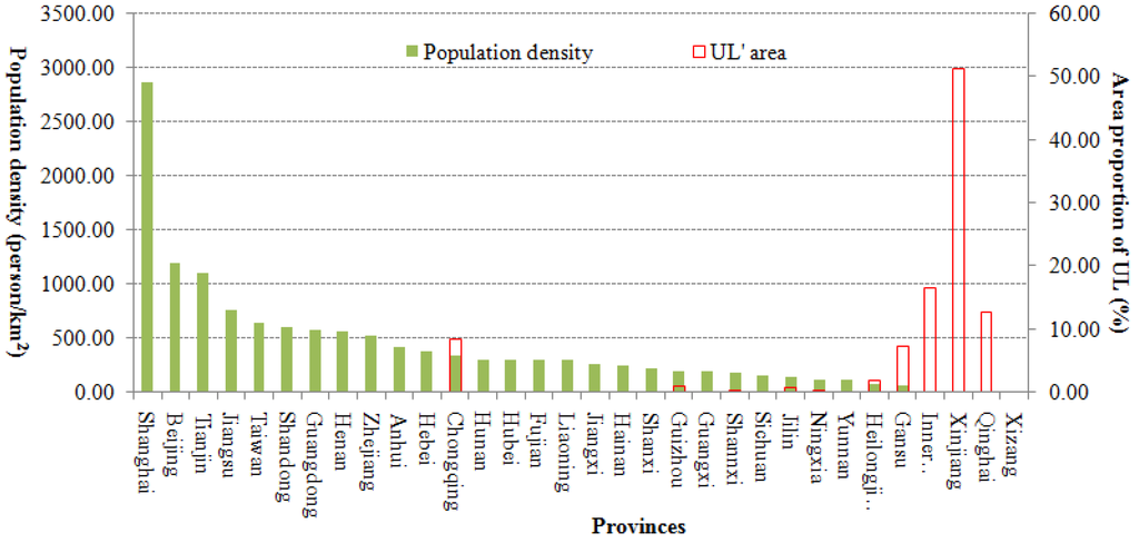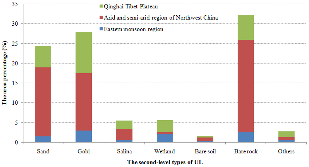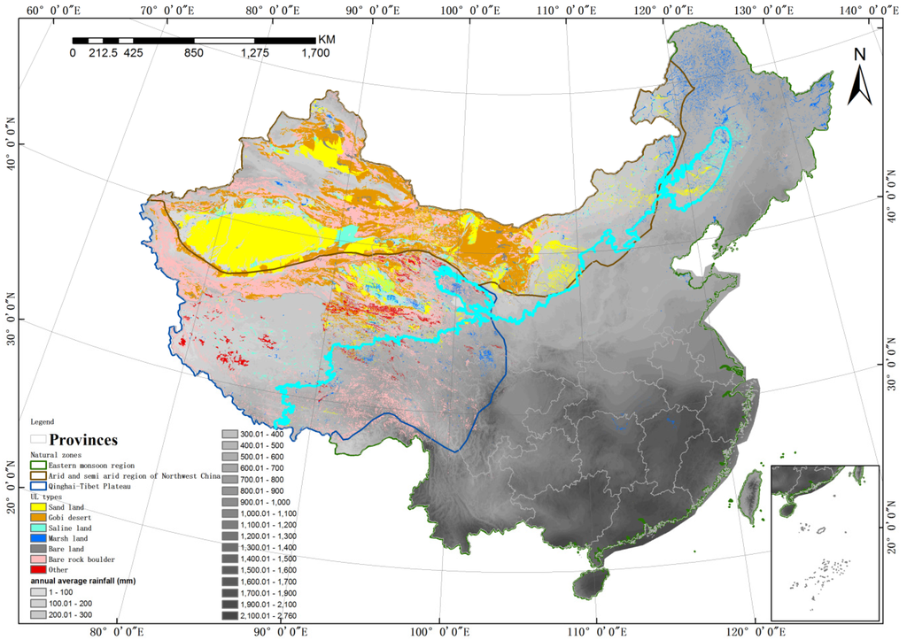 In summary, UL is a dominant landscape type in China, but is mainly located in arid and semi-arid regions, and the Qinghai-Tibet Plateau, with fragile ecosystems. These areas suffer from frequent natural disasters, such as snowstorms, dust storms, desertification, and soil erosion [43].
