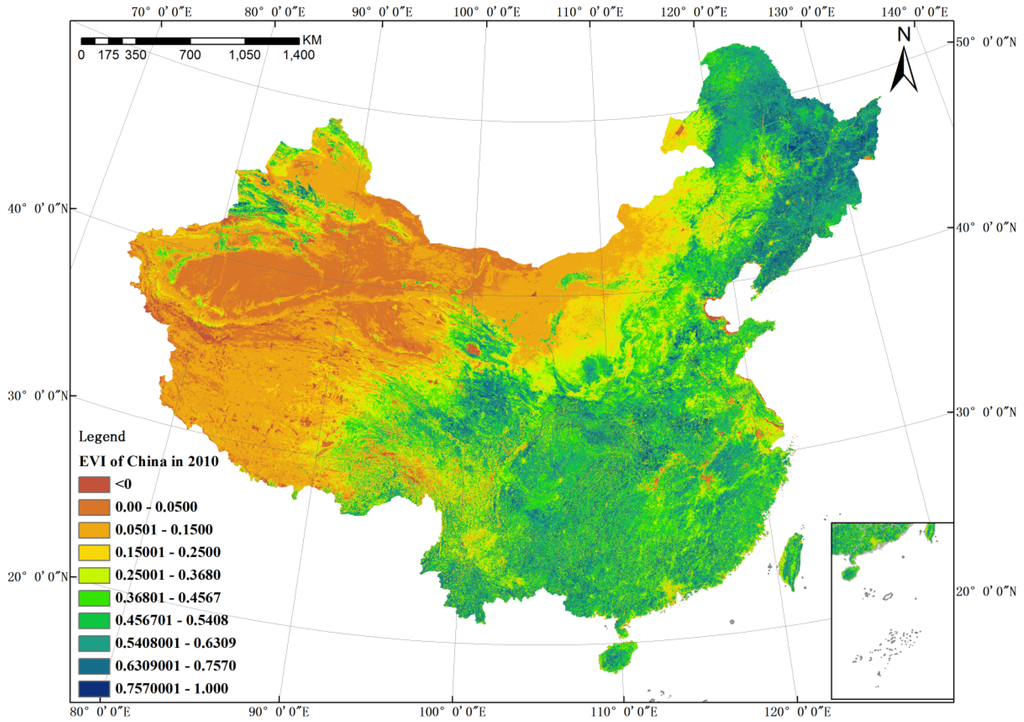 The enhanced vegetation index (EVI) of China on 12 July 2010.