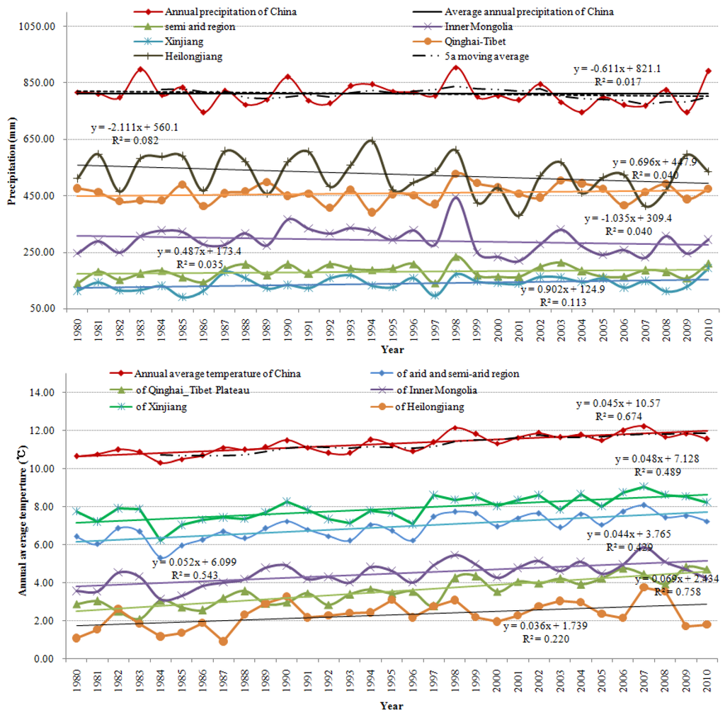 Linear trend analysis of average annual precipitation and annual mean air temperature from 1980 to 2010 in China and in the Arid and Semi-arid region, Qinghai-Tibet Plateau region, Inner Mongolia Autonomous Region, and Xinjiang Autonomous Region.