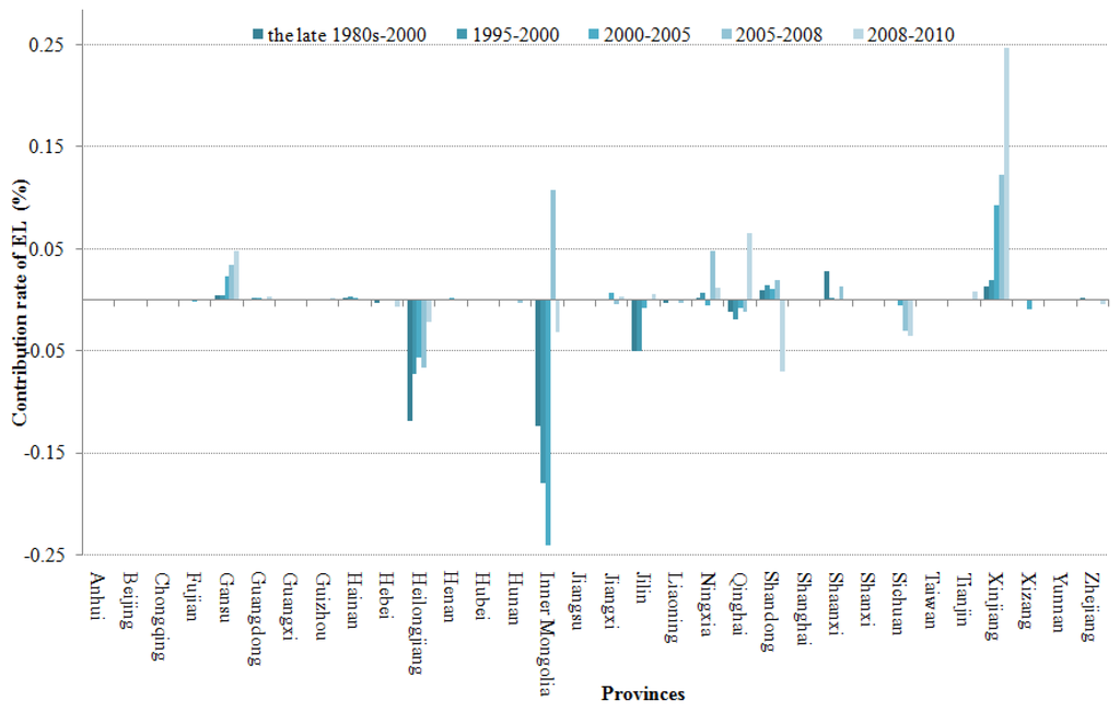 Moreover, in the other provinces of China, the EL exhibited fluctuations. In some provinces, the EL values were negative during the first periods of monitoring, and positive in the last periods (e.g., Jilin and Qinghai). Others were positive at first, then negative later (e.g., Shandong and Shannxi). In still other areas with very little UL, such as Hebei and Hubei, changes were not regular. In Jilin Province, UL changes related to cultivation in wetland areas were the main contributors of deterioration in the local environmental quality during the early study period. In contrast, it was grassland degradation due to over-grazing in Qinghai Province, which contributed most to deterioration of the local ecosystems there.