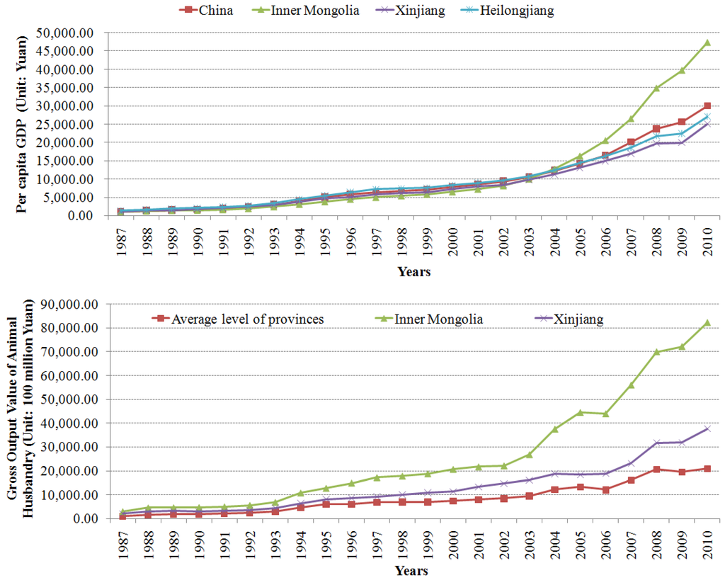 UL changes contributed generally to the exacerbation of regional environment quality during the study period. Some factors came from human activities, and some came from regional climate changes. Yi et al. [31] said that since the reform and opening up of China, UL has been occupied continuously by other land-use types because of rapidly economic development, industrialization, urbanization and the demand for recovering regional ecological services. This is particularly true in China’s ecologically fragile areas, such as Xinjiang and Inner Mongolia. With the rapid increase in population (about 1093 million in 1987 and 1340.91 million in 2010) and rapid development of the economy (GDP 1205.86 billion CNY in 1987 and 40,120.20 billion CNY in 2010), the demand for land increased unavoidably. This resulted was a continual decrease of UL net area and increase of the area of other land-use types, which can cause the change of regional environment quality to some extent. For example, the reclaiming farmlands in the marsh areas and the over-grazing of grasslands met the demand of food or economy, but contributed to the deterioration regional environment. As one of the main animal husbandry areas, the Inner Mongolia owned the higher gross output value of annual husbandry than that of the average level of provinces (Figure 7), which has become the ineludible factor causing grassland degradation because of over grazing.