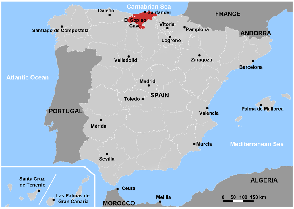 Map of Spain with the El Soplao Cave location, capital cities of autonomic communities and the limits for Spanish provinces.