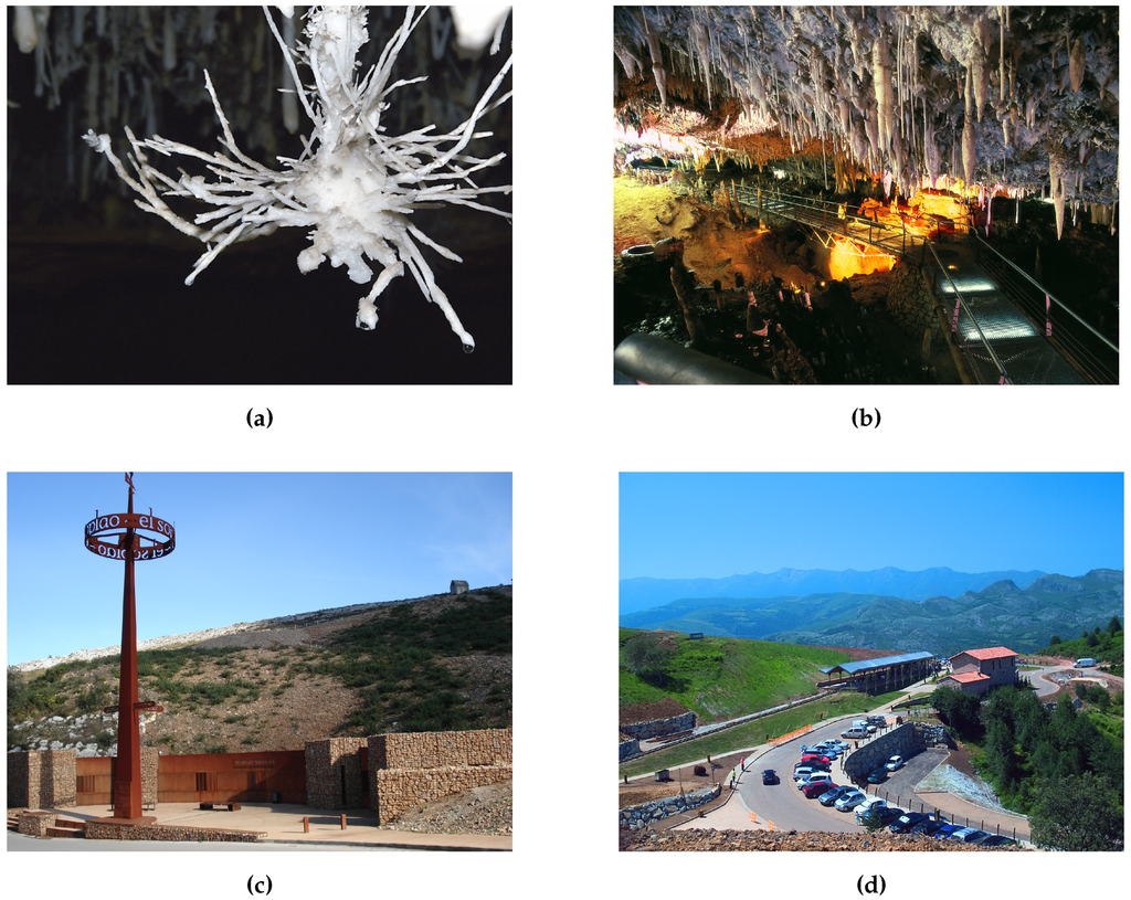 Different photographs of El Soplao Cave: (a) Eccentrics. (b) Gangway inside the cave. (c) Facilities for the “Tourism-Adventure Visit“. (d) General view of the site during the implementation of the works.
