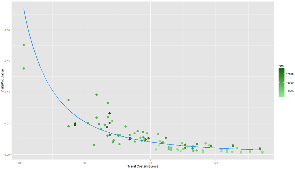 Each point in Figure 4 represents a different visitors origin point and comprises the visitation rate (y-axis) and the travel cost (x-axis). The rent of each region is represented by a color scale and reflects differences in the cost of living among regions.